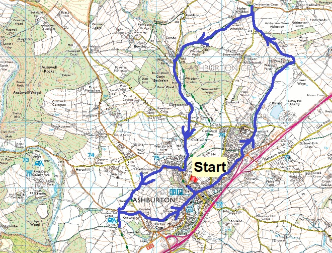 Route – Rockpark Cross – Linhay Quarry – Waye – Owlacombe Cross – Dartmoor Way – Whiddon – Belford Mill – Cuddyford Cross – Great Bridge – Summerhill Cross and Lane – Ashburton