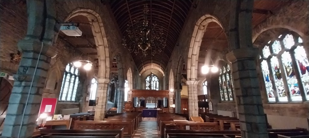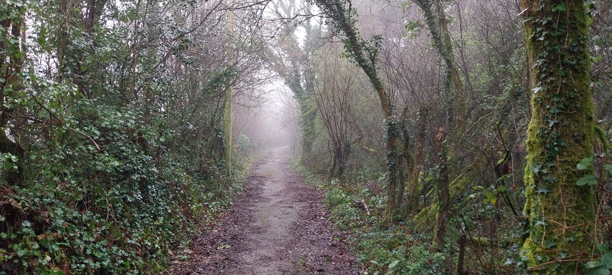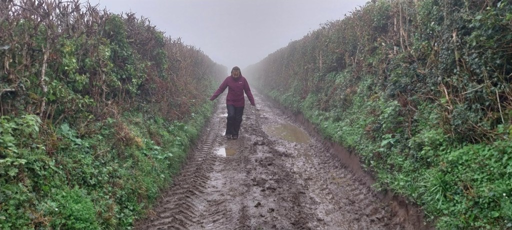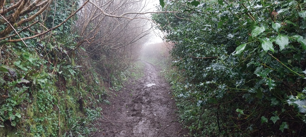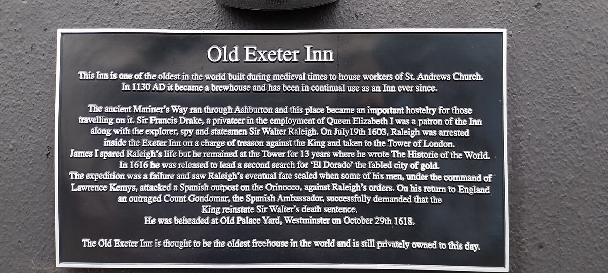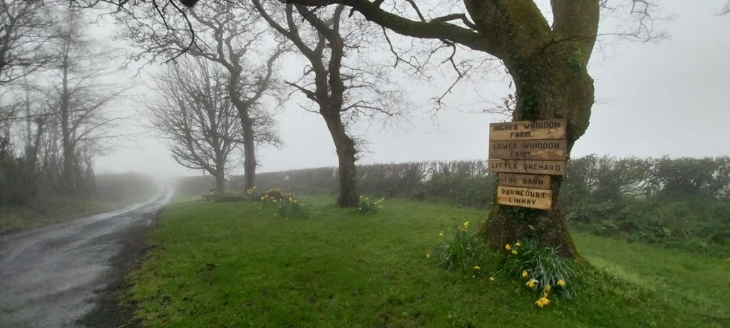 We’d parked on North St, the church can be seen over on the right through the mistWe decided first to head out of town eastwards towards the quarry, passing lots of independent shops and old housesWe walked around the new road, passing entrances to the quarry, no views in today howeverDown a murky lane towards WayeSome daffodils brighten the canvass a littleGreat views back down to Ashburton as we climb to Owlacombe CrossOwlacombe Cross, this was Dartmoor square number 2 along with Ashburton itself.There is a little bench here, so we sat and had a sandwich, trying not to get dripped on as the earlier rain fell from the tree branchesWhiddon, can’t remember if this is Higher or LowerThe path required careful negotiation, Linda expertly traverses this section with good arm out balanceBelford Mill doing its Flatiron impersonation, this is a Dartmoor square as well.Another muddy track around the back of AshburtonSummerhill Lane, leads down to the River Dart, it only seems to go that far and nowhere else on the map, however its a Dartmoor square, so we came to look!Ashburton churchAnd insideThe Old Exeter Inn, which is indeed very old if the sign is to be believedVery very old, some very famous people have drunk in this place and for Sir Walter, the place where he was arrested. I’m always a little unsure about the claims of being the oldest, biggest, longest, tallest of something. But its certainly got some claim to fames here.