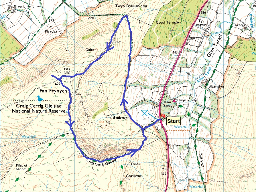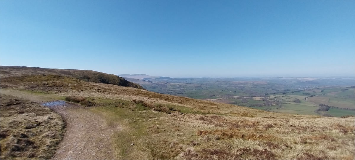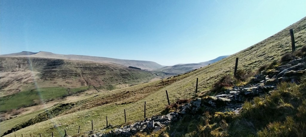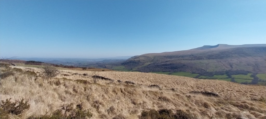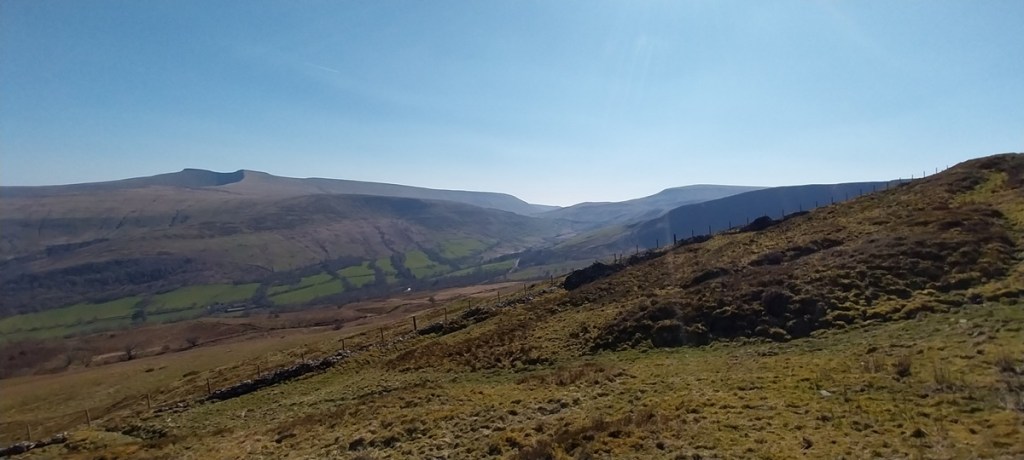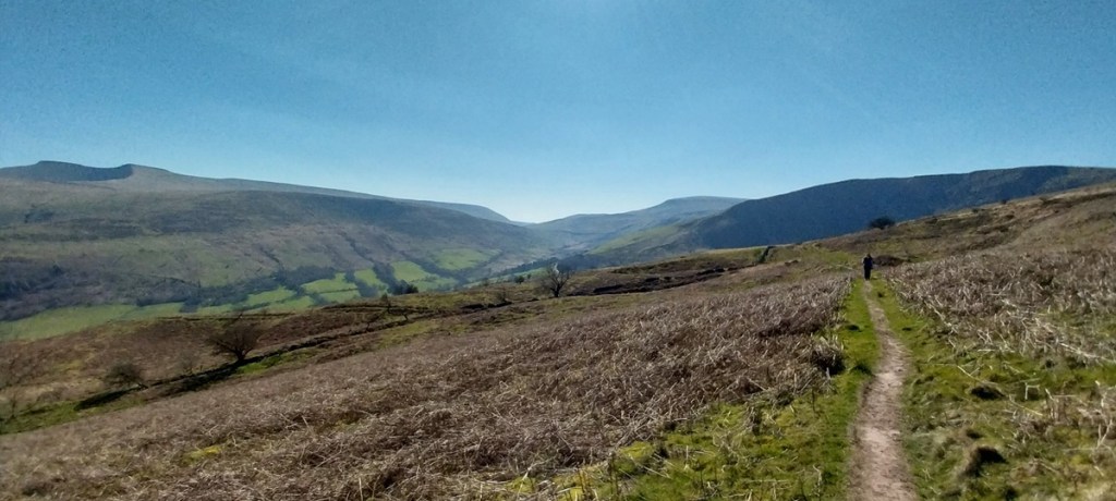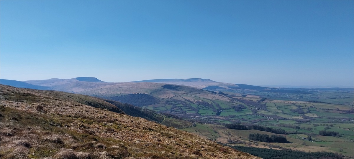 Stood by the A470 looking out towards the town of Brecon, the weather is stunning and we are ready for the offTurning around Linda is ready on the right hand side, we will head through the trees towards the cwm below Craig Cerrig GleisiadLooking back along the woodland path, a gentle incline all the wayA tantalising glimpse of the cwm, we would turn right hereWe traversed a lovely path with views right to Pen y Fan and Corn Du, the town of Brecon in the distanceA fab path with fab views, we stopped for a brew just along hereWe had turned left below the trees down there and climbed up this path, heading for Fan Frynych. Mid Wales is stretching out beyondTo our left now is Pen y Fan and Corn Du. The A470 runs through the middle of the picture heading over the Brecon BeaconsThat’s the Black Mountain in the distance, we will be there tomorrow!The western side of the Brecons has the Black Mountain (Fan Brycheiniog) and Fan Gyhirych to the left. The Black Mountain walk is a classic, but I’ve heard the Fforest Fawr area holding Fan Gyhirych is a decent place as well. We had a stop here for lunch.Lovely views for lunch to Mid WalesNo one now at Fan Frynych summit, so I get a photo which includes Pen y Fan behindAnd the other way has (left to right) Fan Llia, Fan Nedd, Fan Gyhirych and the Black Mountain right of the trigFrogspawn on the way to Craig Cerrig GleisiadDropping down first and then up as we get lovely views into the cwmSummit of Craig Cerrig GleisiadRounding the top we get great views in and down and across the cliffsThat view out along the A470 towards BreconThe angle of the photo shows how steep this bit is. A lady behind us slipped on a particularly greasy grassy section, she was covered in mud but assured us that she had a change of clothes in the car!One last look back to Craig Cerrig Gleisiad. A superb walk and we took our time with two stops for a coffee and the lunch stop. Getting better at planning these walk stops!!