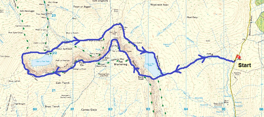 Route – Llyn y Fan Fawr – Bwlch Giedd – Fan Brycheiniog (Black Mountain) – Fan Foel – Bwlch Blaen-Twrch – Picws Du – Bannau Sir Gaer – Llyn y Fan Fach – Waun Sychlwch – Cefn Bryn y Fuwch – Beacons Way – Llyn y Fan Fawr – Just south of Bwlch Cerrig Duon