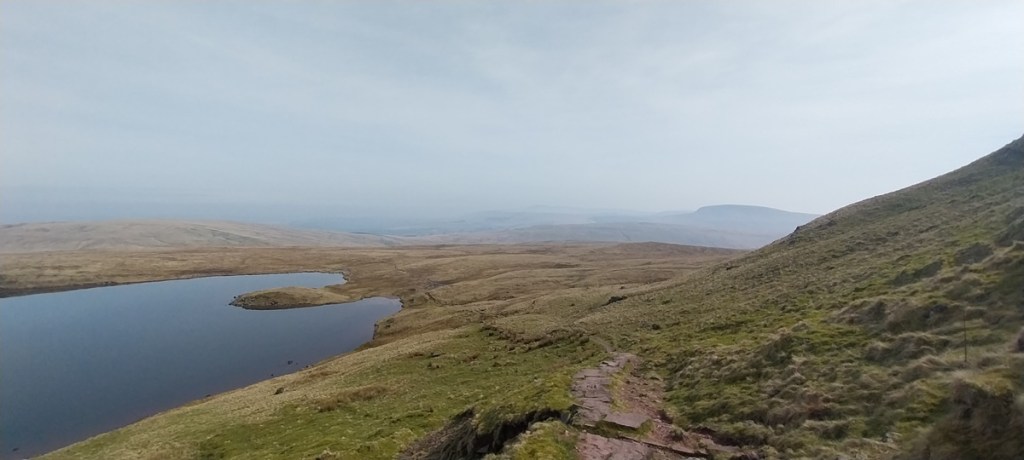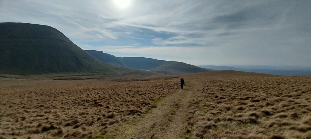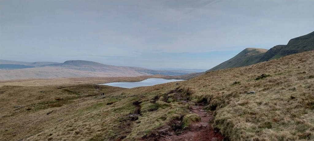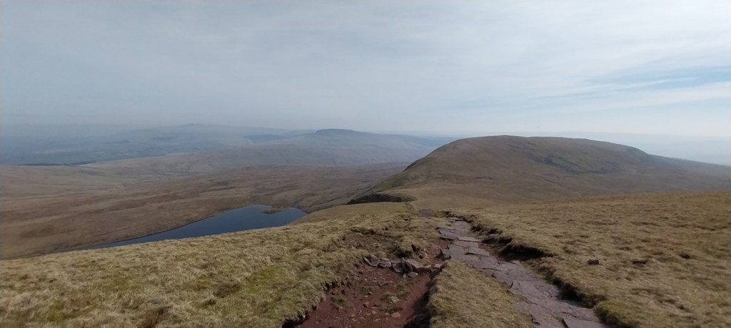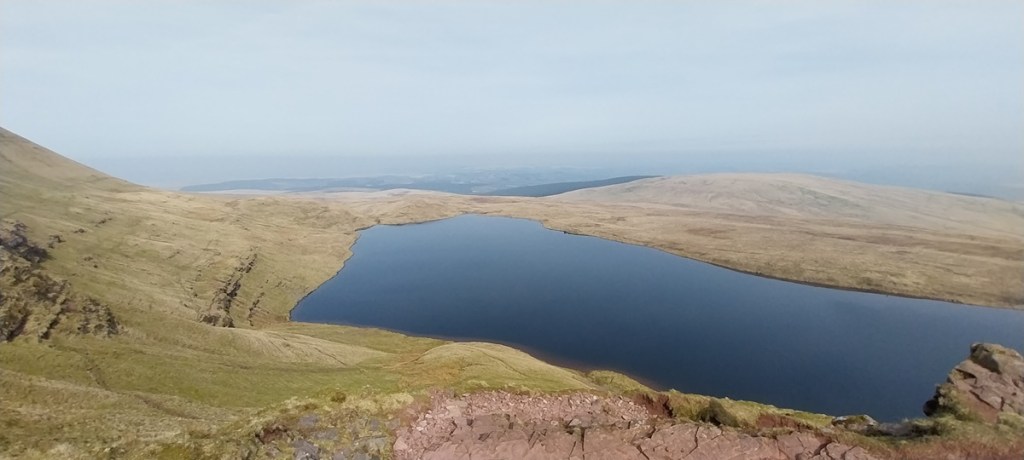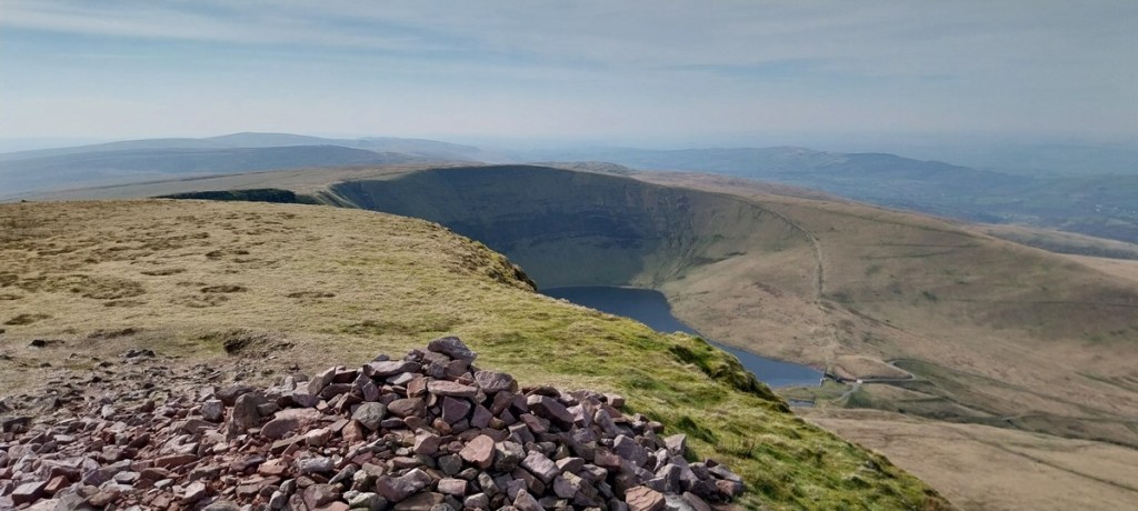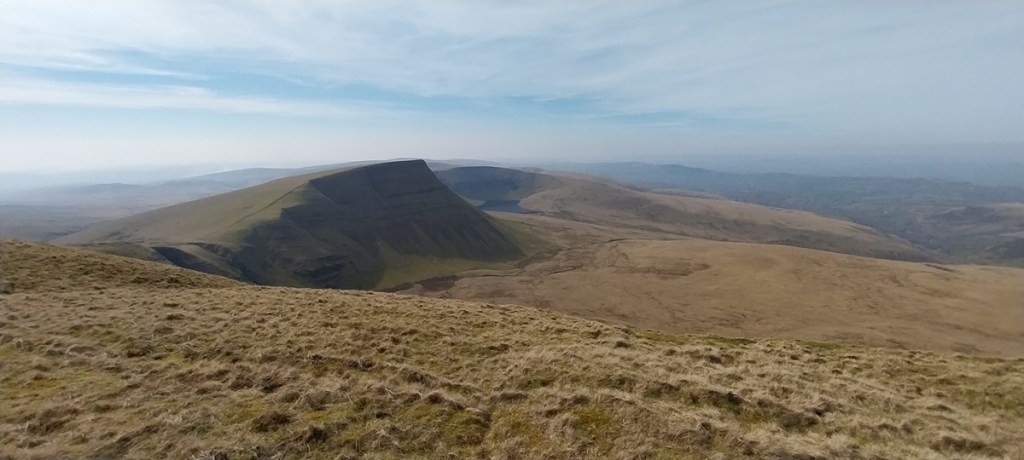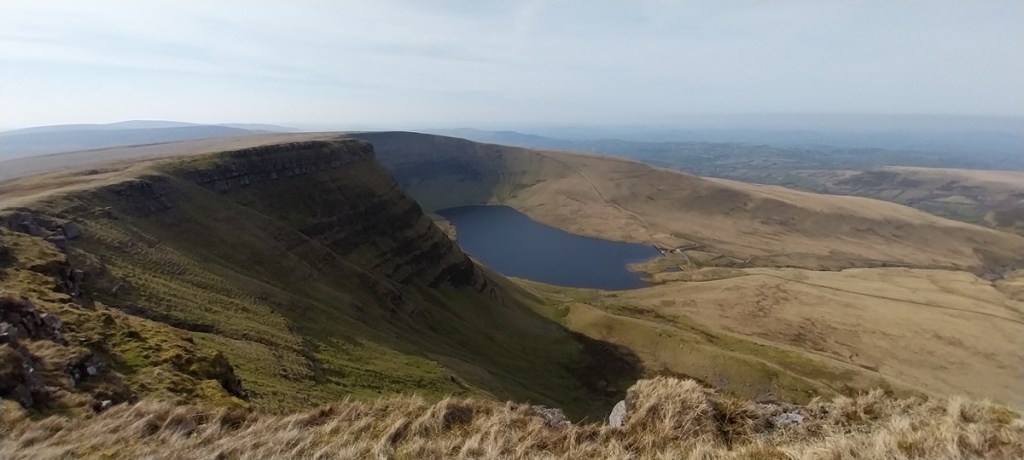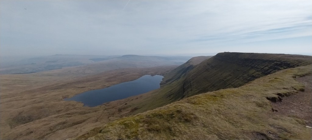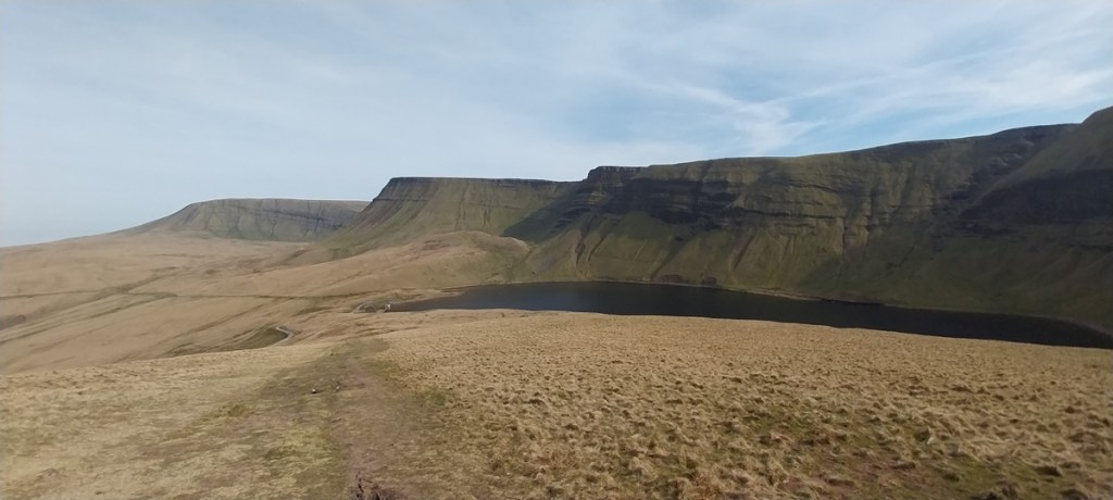 I’ve had this walk in mind for the last 3 years and finally I pulled the car into some roadside parking and looked across the yellowy grass towards the high ridge that held Llyn y Fan Fawr beneath it. It was worth the wait. The weather was again, unbelievably kind to us. Apart from hazy distance views, we had sunshine, light winds and t-shirt walking weather. The only real trouble was the start and end over boggy ground, but we are used to that on Dartmoor. We set off and headed for Llyn y Fan Fawr, stopping about 3/4s of the way up for a coffee. I’m not sure we picked the right route of less or more boggy ground but we arrived in good time and quickly set about the main climb of the day, to Fan Brycheiniog, which at 802 metres would be the high point of the day. Once at height we turned right for the trig point, all the time looking back at the views and the duo setting up their hand gliders. Just as we reached the trig point, one of the duo serenely passed us, turning at Fan Foel to go back along the face of the ridge. We carried on to Fan Foel, catching our first views to Picws Du and Llyn y Fan Fach as we arrived at the cairn. It was approaching lunch time so we found a spot giving us a good view west to Llyn y Fan Fach and the next couple of hours of our walk. Full up we set off first for Picws Du and then the top overlooking Llyn y Fan Fach, called Bannau Sir Gaer. We dropped down to the Llyn, crossing the dam and following a leat for a short section to the Afon Sychlwch and the dam there, it was time for another coffee stop and time for a biscuit or 3. We had a decision to make here, either we follow the Beacons Way which hugs the base of the ridge we had just walked, or cut directly across the hillside for the base of Fan Foel. The latter option won out, and the path was a good one grassy and not boggy, giving us some good views to the steep slopes above. This bit took longer than I expected, and we climbed up to the Beacons Way a bit tired, so we planned another stop as we rounded the corner heading back to Llyn y Fan Fawr. We looked out towards Mid Wales with the Usk Reservoir in view, as we enjoyed a leisurely stop off, enjoying the light as the sun turned towards the golden hour. We quickly made the Llyn again and started off dropping down towards the car, we started off on a different route but soon joined our outward path and made the car. Delighted with our walk and relieved to finally make it here. All that was needed was a pub stop off for a celebration pint, the plan was The Ancient Briton, apparently the Wales pub of the year in 2025 (according to the sign outside) but the world, his wife and hamster was turning up at 5pm, so we did a quick about turn for the Penycae Inn a mile or so back up the road and enjoyed a nice pint in a busy but not rammed pub. A fine end to a great day, the next day would be another walk and an epic.
