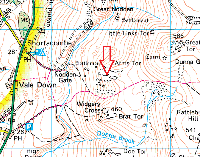 Arms Tor is another of those tors that is surrounded by more illustrious neighbours. With Great Links Tor to the east and Brat Tor to the south, Arms Tor can easily be overlooked. It is worth a visit for the views of those tors and, like the other tors in this area, the view to the west to Cornwall. There are a few large outcrops here and a fair bit of clitter to make up the tor. The easiest approach to this tor is probably by parking at the moorland car park behind the Dartmoor Inn near Lydford, its then a simple walk along the grassy path, across the bridge over the River Lyd and up to Arms Tor. Arms Tor is not in a military firing area however Willsworthy range is nearby.