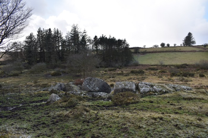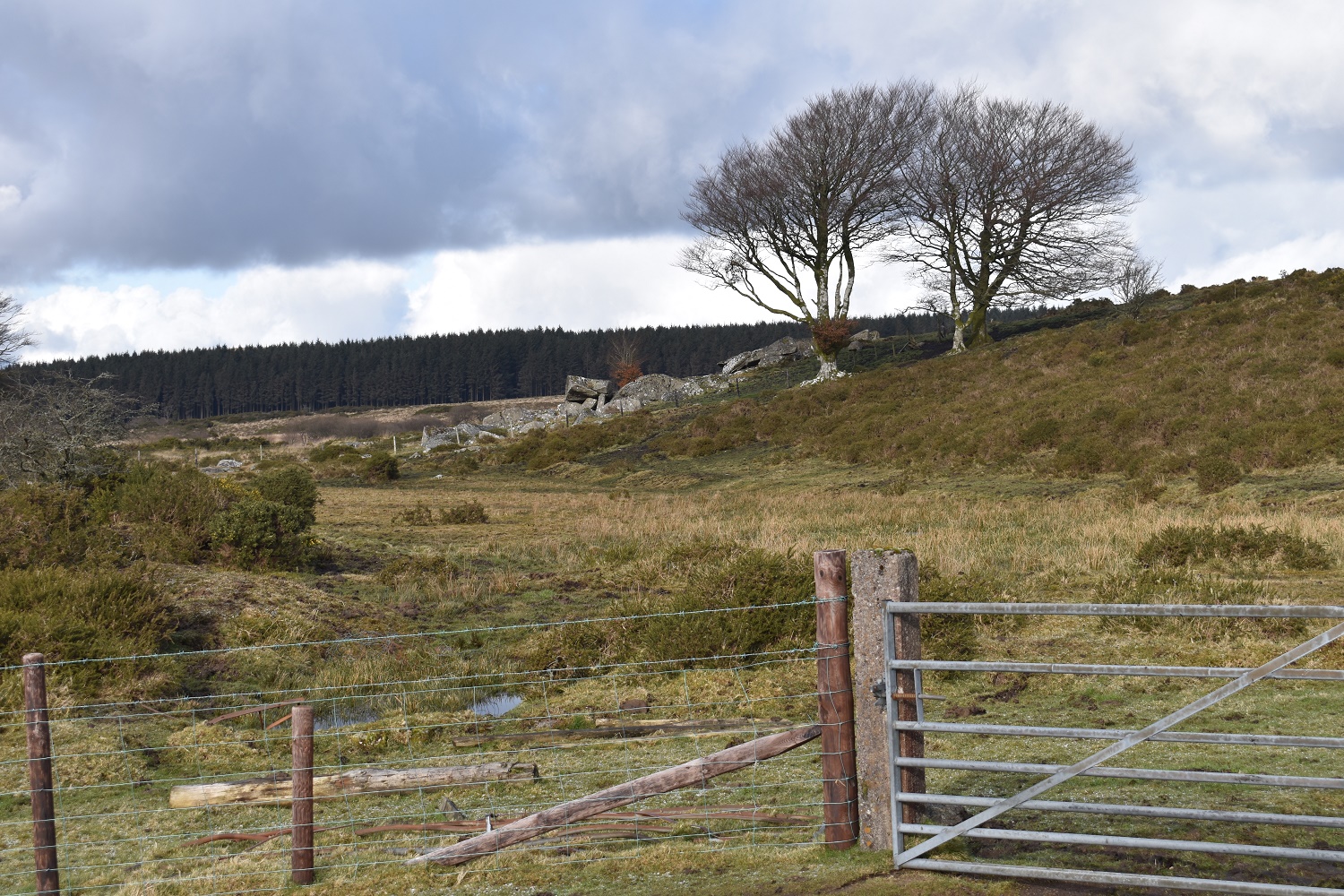 This is a small outcrop which sits just the other side of a fenced off piece of land. The open access land around it, which includes the Two Moors Way makes for an easy approach down to this tor and the gate beside the Walla Brook an even easier way in. The rocks themselves sit just beside a clump of trees just uphill from The Walla Brook on Cator Common, the views aren’t too bad with the aspect to the north giving the best view up to Water Hill and the Warren House Inn. There are no military firing areas near here.