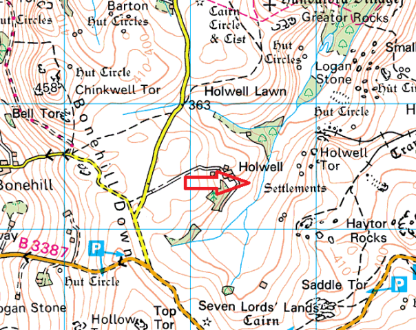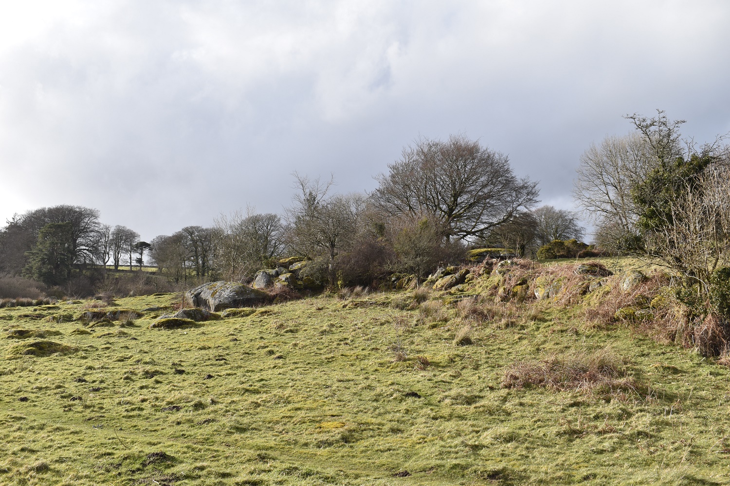 This tor sits below Saddle Tor Cottage on the way down towards the Becka Brook. It sits in a farmers field, underneath a tree at the edge of one field, spreading into the next one. Its an easy outcrop to get to as there is a public footpath through that field and it can be reached easily from nearby Holwell Bridge and the Boulders of that name. The views from here are pretty decent across the brook towards Holwell Tor, Haytor and Emsworthy Rocks. No military firing ranges near here.