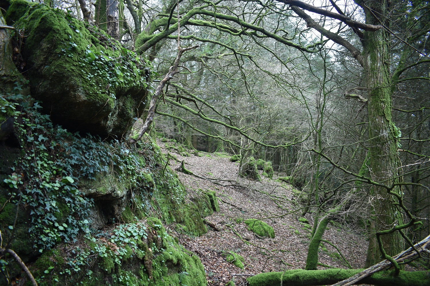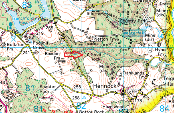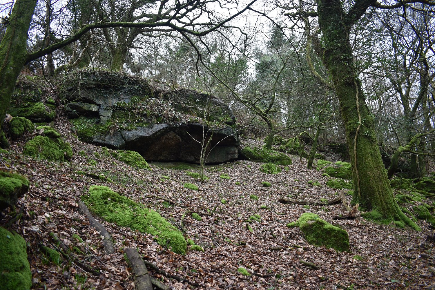 The outcrop sits a hundred metres to the west of Great Rock and runs north to south across a logging path which splits it in half. The tor itself starts to the north of the path with some large rocks scattered around a small area before dropping down the hill with one large rock with a balanced rock on top sitting near the logging path. The outcrop then continues below the path with the outcrop forming a wall like structure as it tumbles down the hill. There are very little views from this tor as it sits within a woodland, mainly made up of non native trees. There are no military ranges near here.