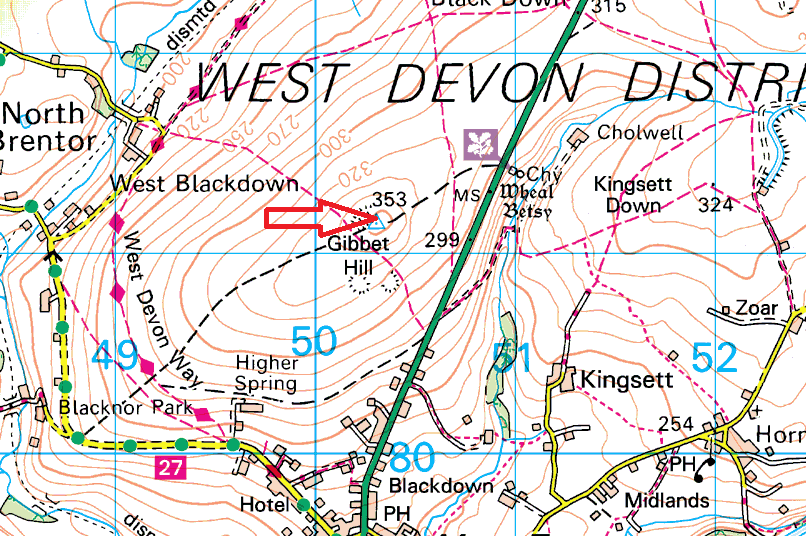 Gibbet Hill summit and the tors around Cox Tor and White Tor. This hill holds some mine shafts, where tin was sort. However the name of the hill gives a clue to its main use. Back to the 1700s and highwaymen such as Captain Jack would have been left at the gibbet. The gibbet was either an iron cage or a post, and the transgressor would have been tied to the pole or simply left to starve in the cage. The road of the times ran under the hill warning travelers of the results of crimes.