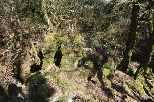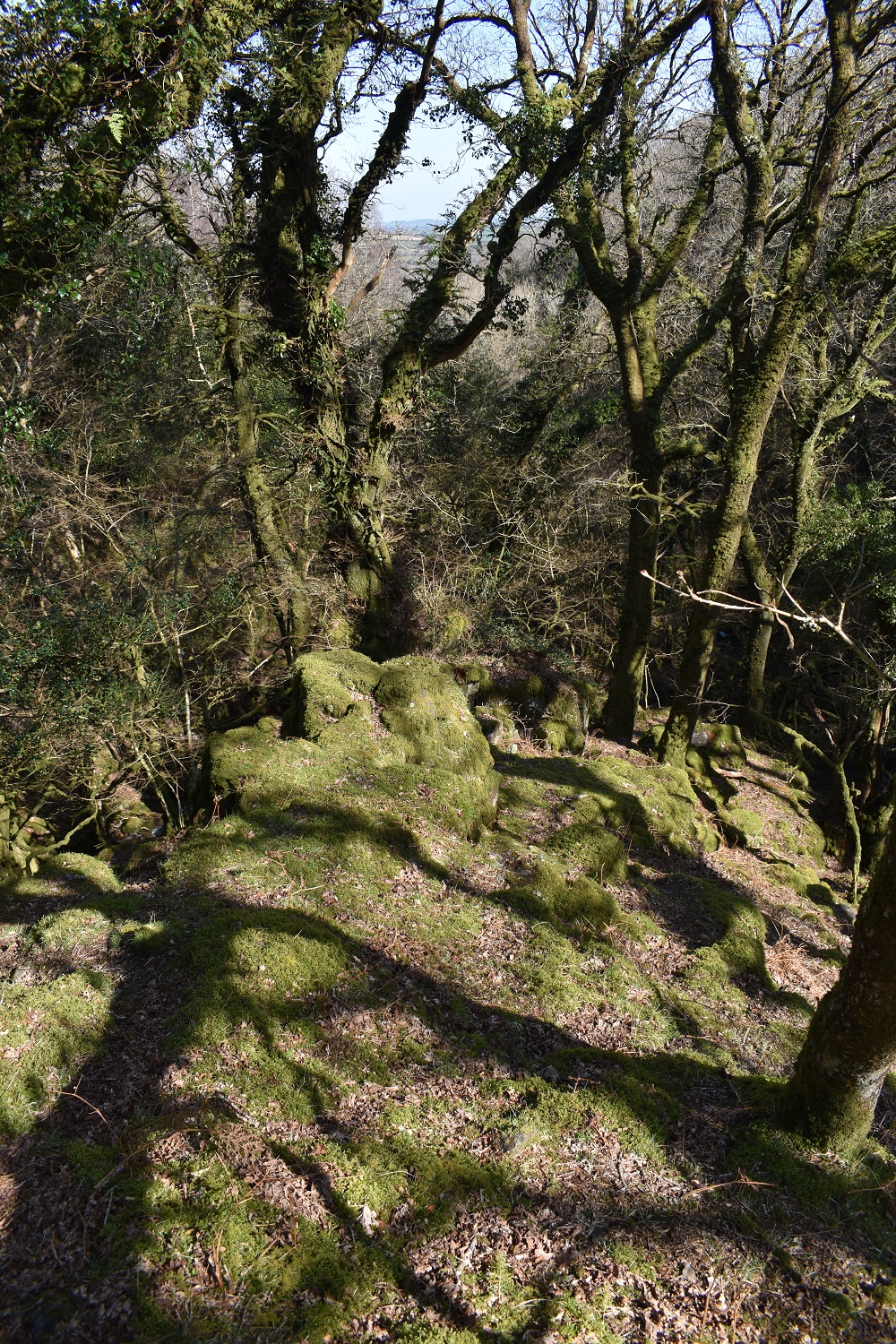 This tor unveils itself as you head further down the hill. The hill in question is more of a spur of land sticking out, flanked on one side by the infant Holy Brook and one the other side by the stream which comes down from the north western side. As you head into the trees you will see more and more rock before the outcrop finally appears below. In summer the bracken will cover the hillside so find the path through or hug the streams on either side, however to help there are paths crossing north to south meaning only a few hundred metre walk down to this one. There are very little views from here or any military firing areas.