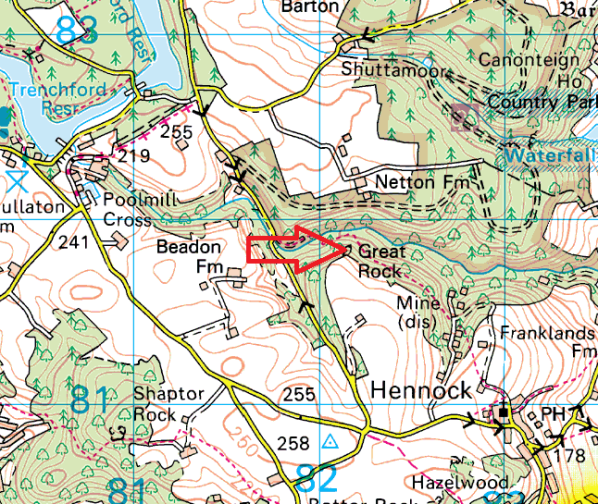 Search for Great Rock, Dartmoor, on the internet and it will bring up various, more famous rock tors on Dartmoor. This one however sits in the woodland a mile north of the village of Hennock on the eastern edge of Dartmoor. The easiest way to get to this tor is to park behind the church in the village and follow the well published walk in this area to the nearby reservoir. This walk will take you through the woodland of the same name, and past Great Rock. Which also has a mine of the same name, where iron ore was extracted for use on Royal Navy ships. The rocks of this woodland tor are big but not too far from the track so can easily be seen, there are no real views, except in winter due to the tree cover. There are no military firing areas near here.