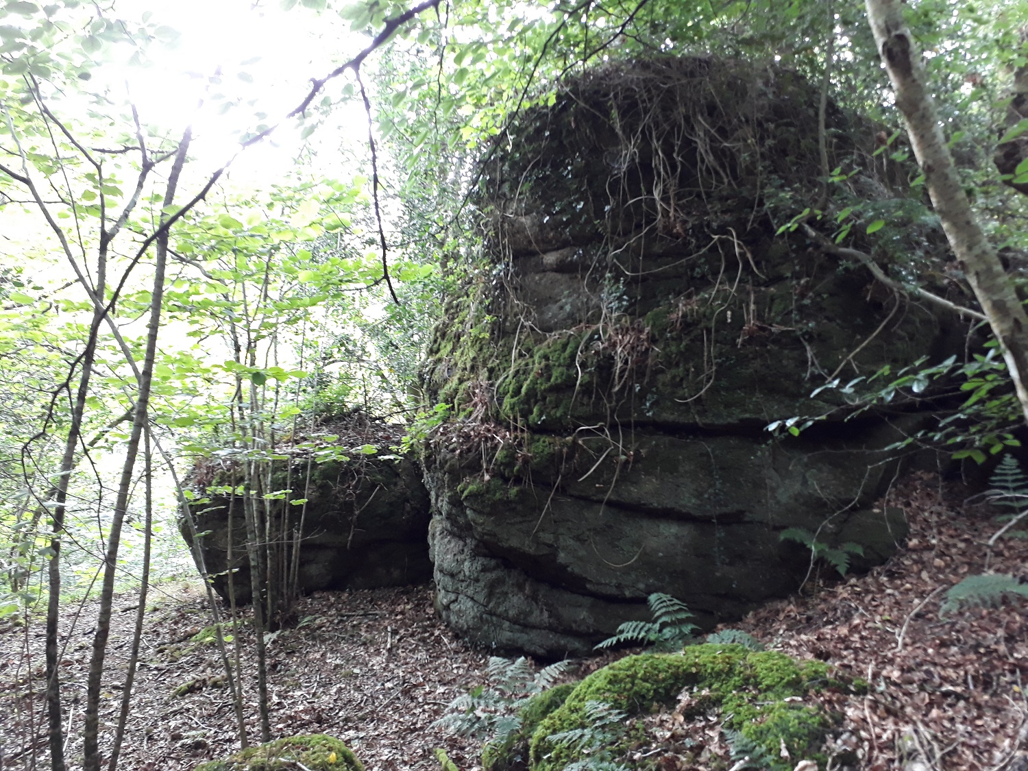Search for Great Rock, Dartmoor, on the internet and it will bring up various, more famous rock tors on Dartmoor. This one however sits in the woodland a mile north of the village of Hennock on the eastern edge of Dartmoor. The easiest way to get to this tor is to park behind the church in the village and follow the well published walk in this area to the nearby reservoir. This walk will take you through the woodland of the same name, and past Great Rock. Which also has a mine of the same name, where iron ore was extracted for use on Royal Navy ships. The rocks of this woodland tor are big but not too far from the track so can easily be seen, there are no real views, except in winter due to the tree cover. There are no military firing areas near here.