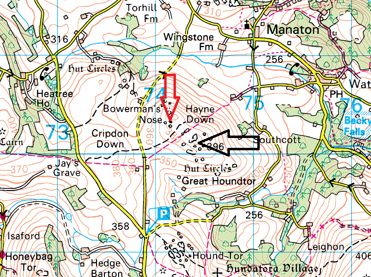 Hayne Down (or Great Houndtor as it is marked on the maps) is almost a forgotten tor, the reason for that is most people visit this area to see the impressive rock stack of Bowermans Nose, which sits on the north western side. However there are two summit areas, with the one to the east (Great Houndtor) the slightly higher one (black arrow below). Views are good from both tops, with Hound Tor, Haytor and Black Hill all in view. As mentioned the Bowermans Nose is on the NW side providing views to Easdon Tor beyond. Hayne Down has a road which pretty much encircles the tor, although parking is probably best either in Manaton or the Hound Tor car park and walking along the road to join the path up. There are no military firing ranges near here.
