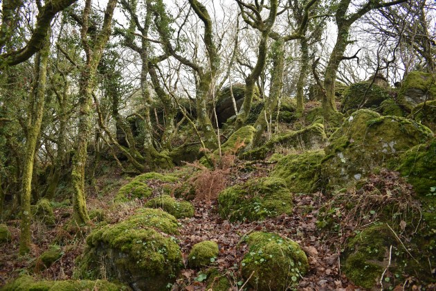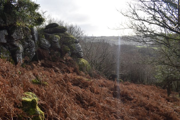 Heading deeper into Castor Woods, passing Kelly Mine Tor and Little Castor, you begin to head uphill, steeply if you take the direct route. At the top of this hill there is a fence, an open field beyond and Higher Castor, sitting just inside the woodland. Its a fine tor which if it was on the moor proper it would be one of the best. There is a part of the outcrop, as it drops a little down the hill, which allows a view down to Bovey Tracey and this shows how big an outcrop this one is, as the outcrop carries on up the hill. This is a tricky outcrop to get to, first find the Kelly Mine path and leave the path easterly below the gate halfway up that path. Head first to Little Castor, then either steeply upwards, or follow the zigzag grassy path which will help with the gradient. There are no military firing ranges here.
