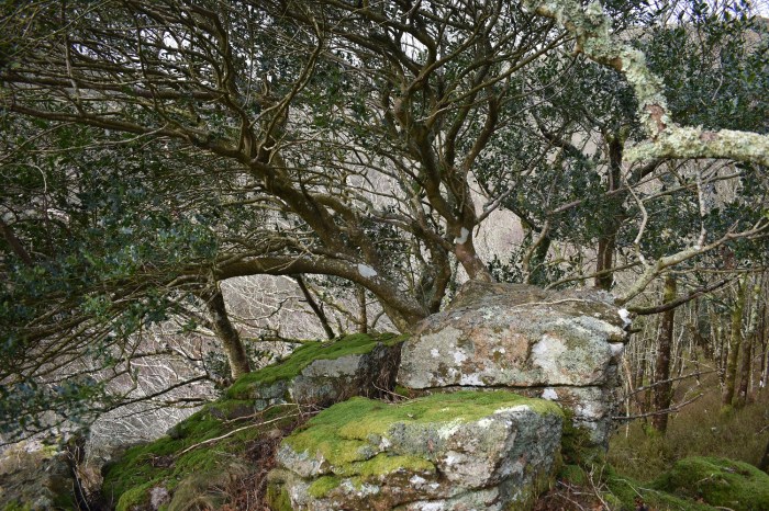 Now this is a list of tors with some tors being easier to get to than others. This one sits in the difficult category, not because it is on private land, more because the area sits at a very steep gradient, covered in mossy clitter and trees. There are rocks everywhere and this is real ankle breaking territory. It might be worth going here with a friend as a fall could be dangerous and there are no marked paths through the woods. To make matters worse the main Two Moors Way path above is cut off by thigh high thick gorse, making it very difficult to reach the trees in the first place. All I can advise is to take a GPS or be brilliant at map reading, head exactly for the two indicated dots on the OS maps that marks Hockinston Tor. You will find the top outcrop with a holly bush on top and a small opening which gives a view over to North Tor. This is probably the hardest tor to get to on my list, its all easy from here on in!! There are no military firing ranges near this tor