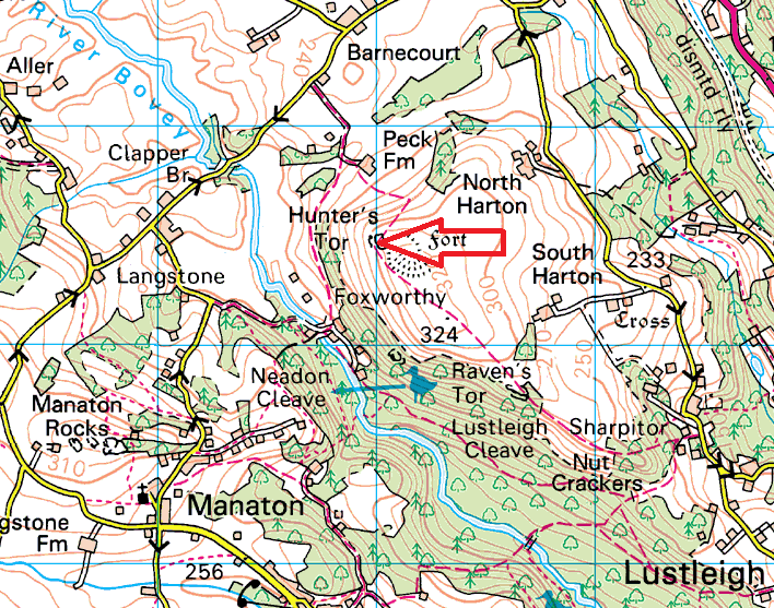 Hunters Tor sits on the end of a short ridge that starts near Lustleigh village. This tor sits high above the River Bovey in the valley below and commands great views north towards Cosdon Beacon and north Devon. Like the other tors along this ridge the views to Hayne Down, Haytor and Black Hill are very good as well. The Bowermans Nose can be made out clearly from here also. There are no military firing areas around this tor.