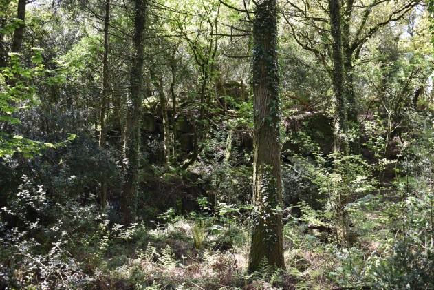 This is a fairly substantial outcrop within the woods to the east of Water, near Lustleigh Cleave. In fact it is a 5 minute walk from the Kes Tor Inn. The outcrop is within the woodland so any views are blocked by the trees, however it is very easy to get to by following the path, turning left at the junction of paths and the outcrop starts there, head up into the woods to see the larger outcrops. There are no military ranges near here.