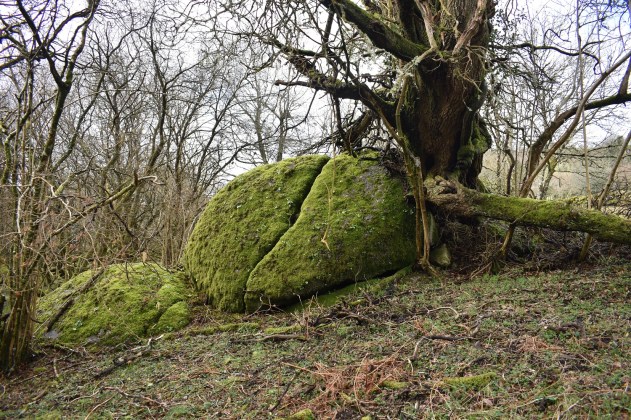 Just in the woods, lies this outcrop. Further to the left and into the woods, just up from the bridge over the stream is a larger boulder