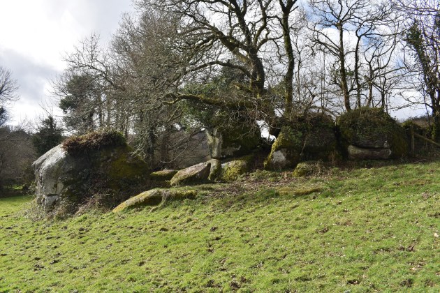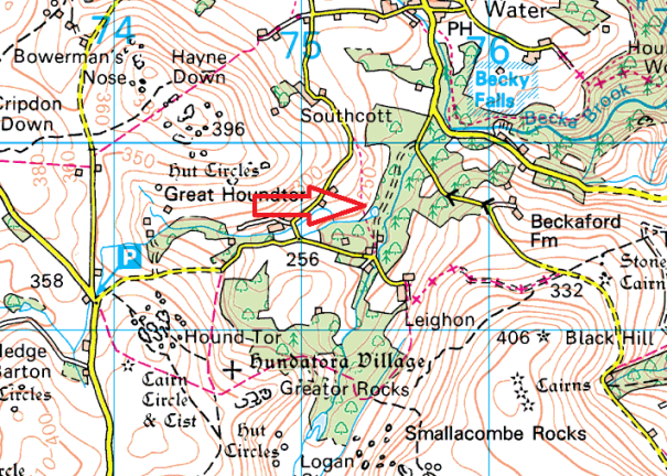 A tor that sits in an open farmers field on a public footpath running through that field. The footpath joins the hamlets of Leighon and Southcott, and if walking from Leighon you will head over a stile into woodland before crossing a stream and finding a gate which brings you to the field. The main part of the tor is against a wall and under the trees, but there are other small outcrops in the open field itself. There is also a smaller rock lower down just inside the woodland, a bit further behind that a larger rock beside the stream. Further up the hill still in the field is another outcrop, I assume also of this tor. A decent amount of rock here for very little effort, however you will probably want to continue onwards to link this outcrop with a walk to or from Manaton or Hound Tor. There are no firing ranges near here.