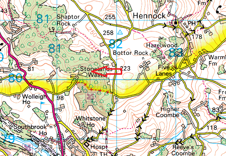 An aptly named tor which sits in the middle of Stonelands Waste, by the main path as it snakes it way towards John Canns Lane. A large rock next to the path gives an idea to what lies behind. There are more outcrops running down the hill passing through non native woodland and into scrub and holly. Keep heading down and you will eventually reach a fence beside the last outcrop to a view across a field. There are no military areas near here.
