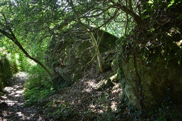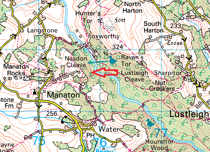 This one appears to be a split tor which runs down the hill a bit. Part of it starts on the lane around the easterly end of Horsham which heads into Neadon Cleave. The last house of that lane has a tarmac track which loops to join another lane to the south. Just below this track is the top most part of this tor, the official footpath is just off the tarmac (below in the high foliage if walking in summer). At the corner is a rock which doesn’t look much until you head below it, it is pretty huge, from here downwards starts the tor, the path below running back into Neadon holds more of this tor. Head along the narrow path from the house into Neadon and past the rocks on your left and then look up after the end of the fence. A place covered in trees but full of large boulders.