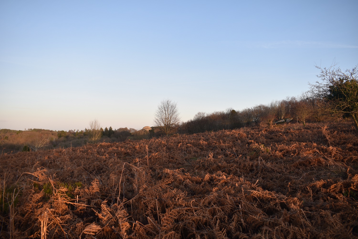 Pepperdon Down, the rocks are on the right and Blackingstone Rock can be seen in the sun straight ahead