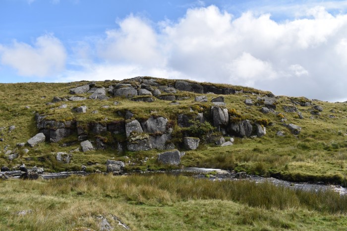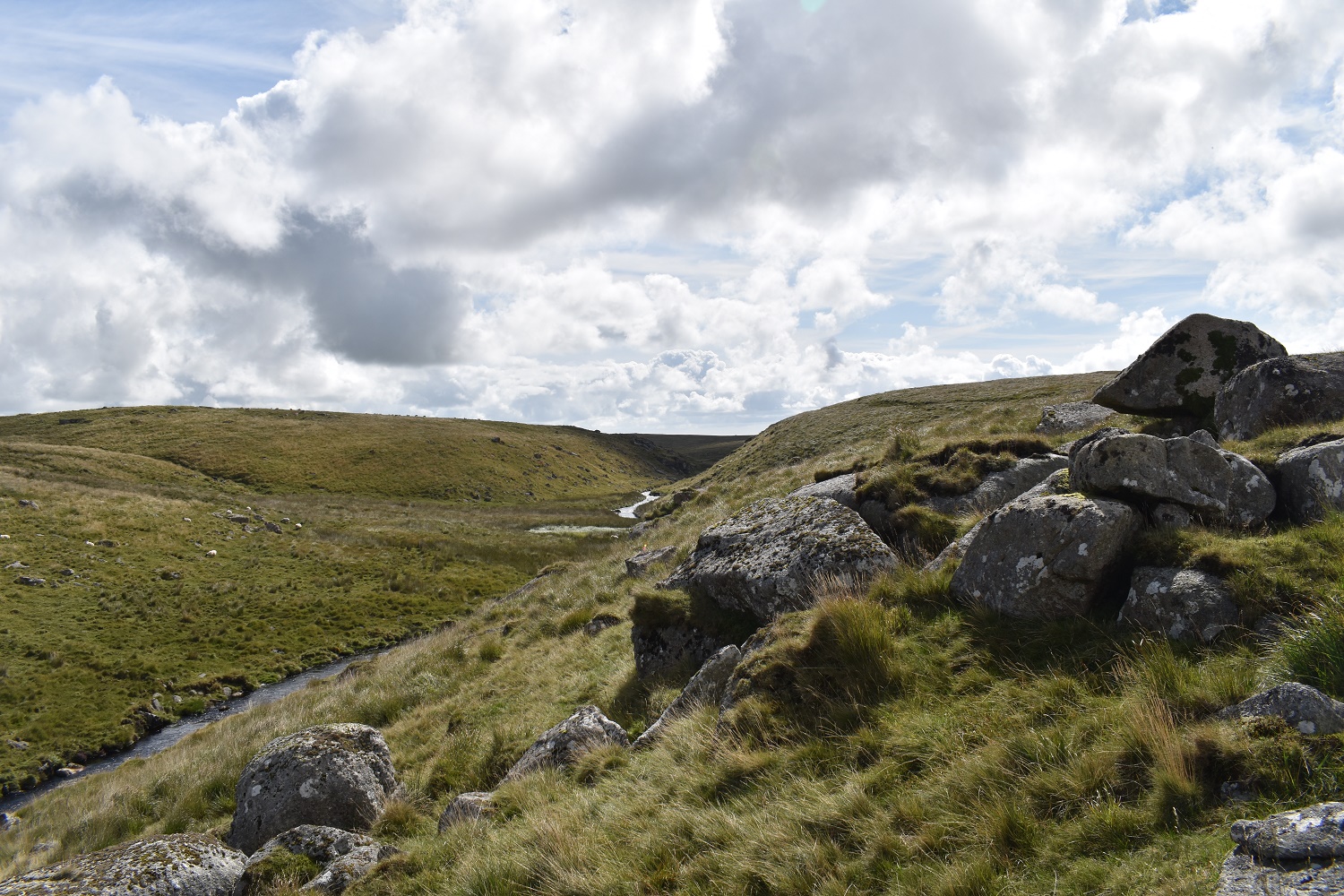 These rocks are neatly situated at either end of the Sandy Hole Pass, just north of the East Dart Waterfall. There are two lots of rocks, simply called north and south to make things very simple. The southern rocks sit either side of the river with rocky outcrops in view as you approach from the waterfall. The northern outcrop is on the western side and sit very near to the Broada Stones. The views are either along the river through the pass or out of the pass northwards towards Kit Steps or south towards the waterfall. Its a fine spot sitting fairly deep into the north moor and is best approached from the south past the waterfall, the best path being to the west of the river. The Merrivale firing range sits to the north and west of these rocks so beware if you are heading that way.