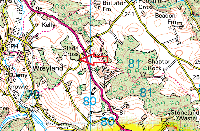 This tor sits beside a narrow lane which leads from Slade Cross, south west, towards Hatherleigh. The outcrop itself sits on the opposite side of the road from the house of the same name within the woodland, some of it stretches a 100 metres into the woodland but can’t be seen as its private. Part of rock itself is right by the road however with more larger boulders behind it just inside the trees which allows for an easy bag. Most are covered by greenery and the best time to see them will be in the winter months. In the garden and above the Slade Acre house is Slade Acre Rock but this isn’t much to talk about so won’t be on my list. The views are ok, if you peer over the house hedge southwards towards Bovey Tracey. There are no military areas near this outcrop.