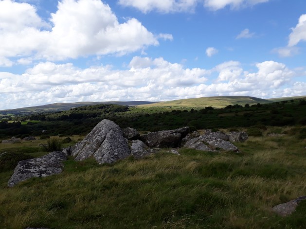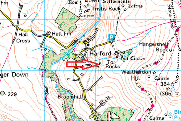 These are a scattering of outcrops and rocks to the south of the Butter Brook, just a short stroll from Harford Gate car park. In fact the only tricky part could be crossing the brook after heavy rain, however there should be a spot where you can jump. There are some pretty good views to the west towards Penn Beacon, with higher ground to the east the view is upwards to Weatherdon Hill. This isn’t really a tor you will have as your main target, however it is likely to be your first or last tor as you park at Harford Gate. There are no military ranges near here.