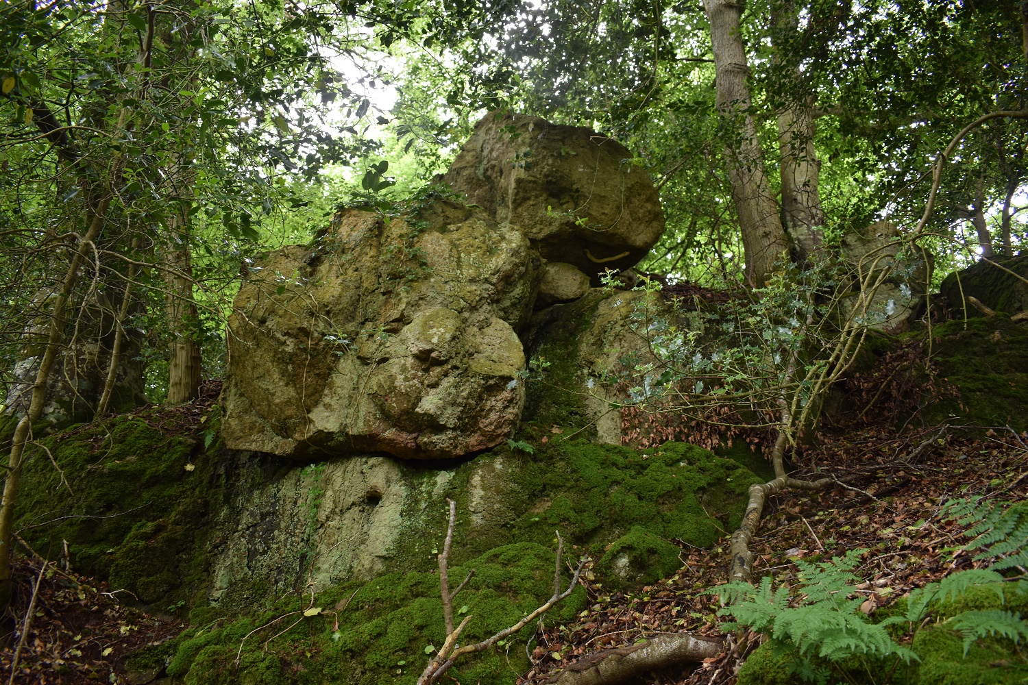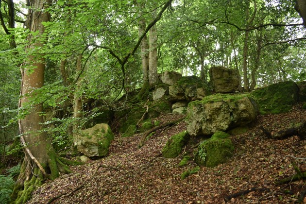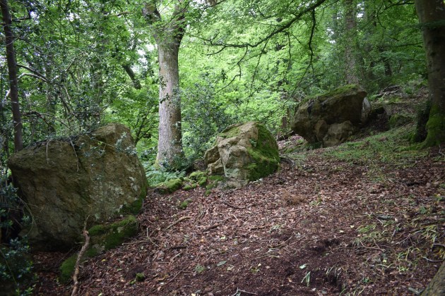 This tor is the nearest one the house of the same name and can be easily reached, either from the banks of the River Teign starting by Dogmarsh Bridge or from the path down from the road around Forder. From either direction you will need to head up into the trees for 40 or 50 metres to see the outcrops, but they are easily found and bagged before continuing on. No views from here nor any military firing ranges.