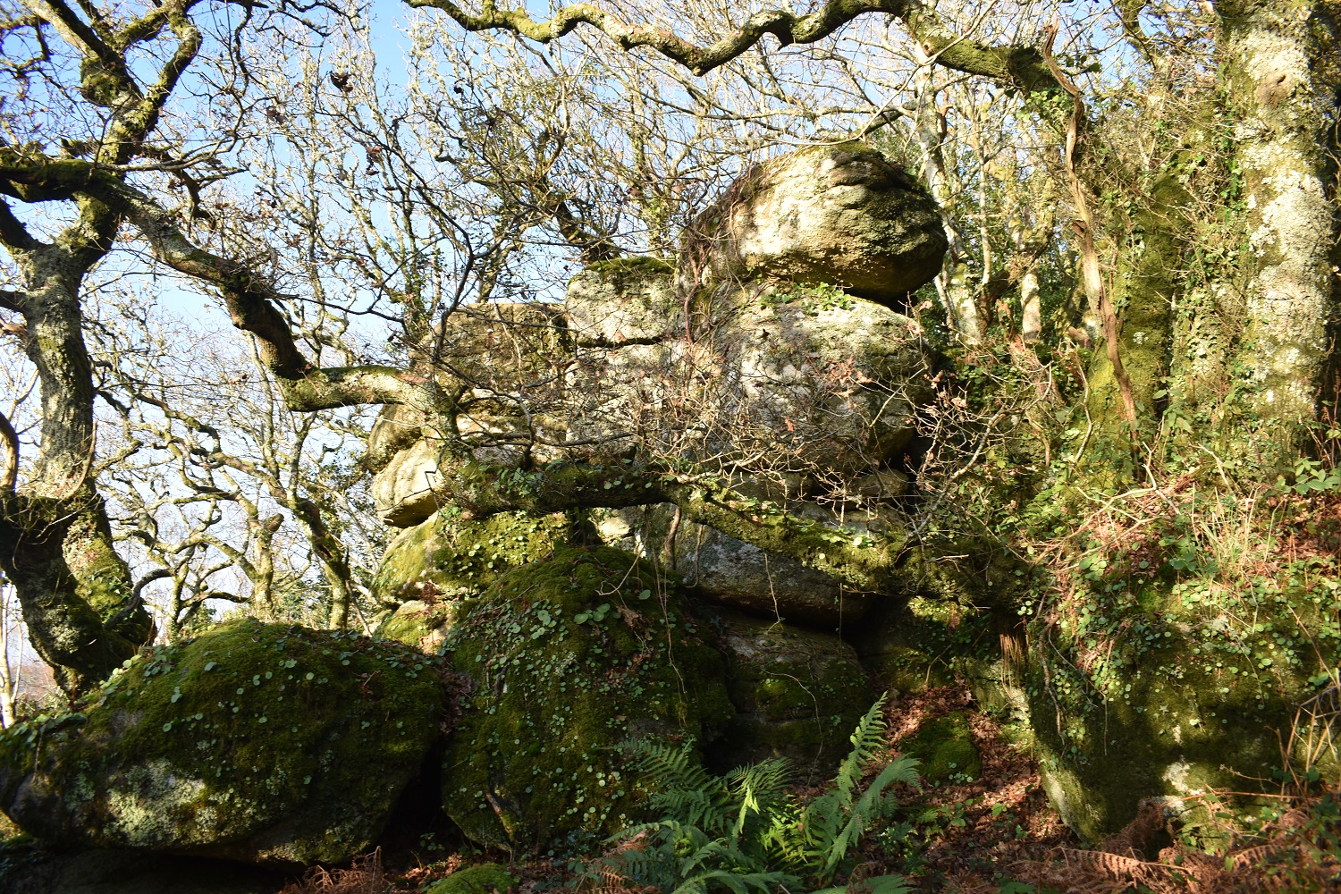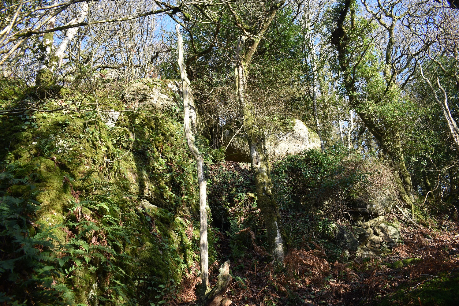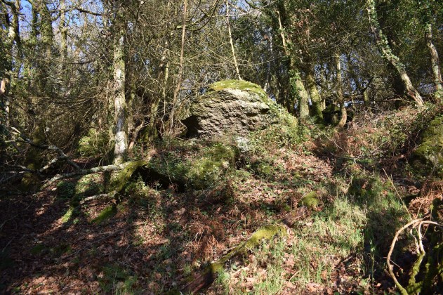 This tor sits between two other tors also starting Wray Cleave hence its name. There are two paths entering the woods from the eastern side, one north of this outcrop and one to the south. Both give access to the woods and a path on the ground will connect all 3. This one however is the only one which in winter, without a canopy, that will give a view across to Black Hill over Lustleigh. The outcrops are very good also and there are lots of them. There are no firing ranges near here.
