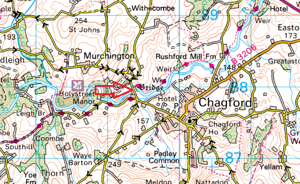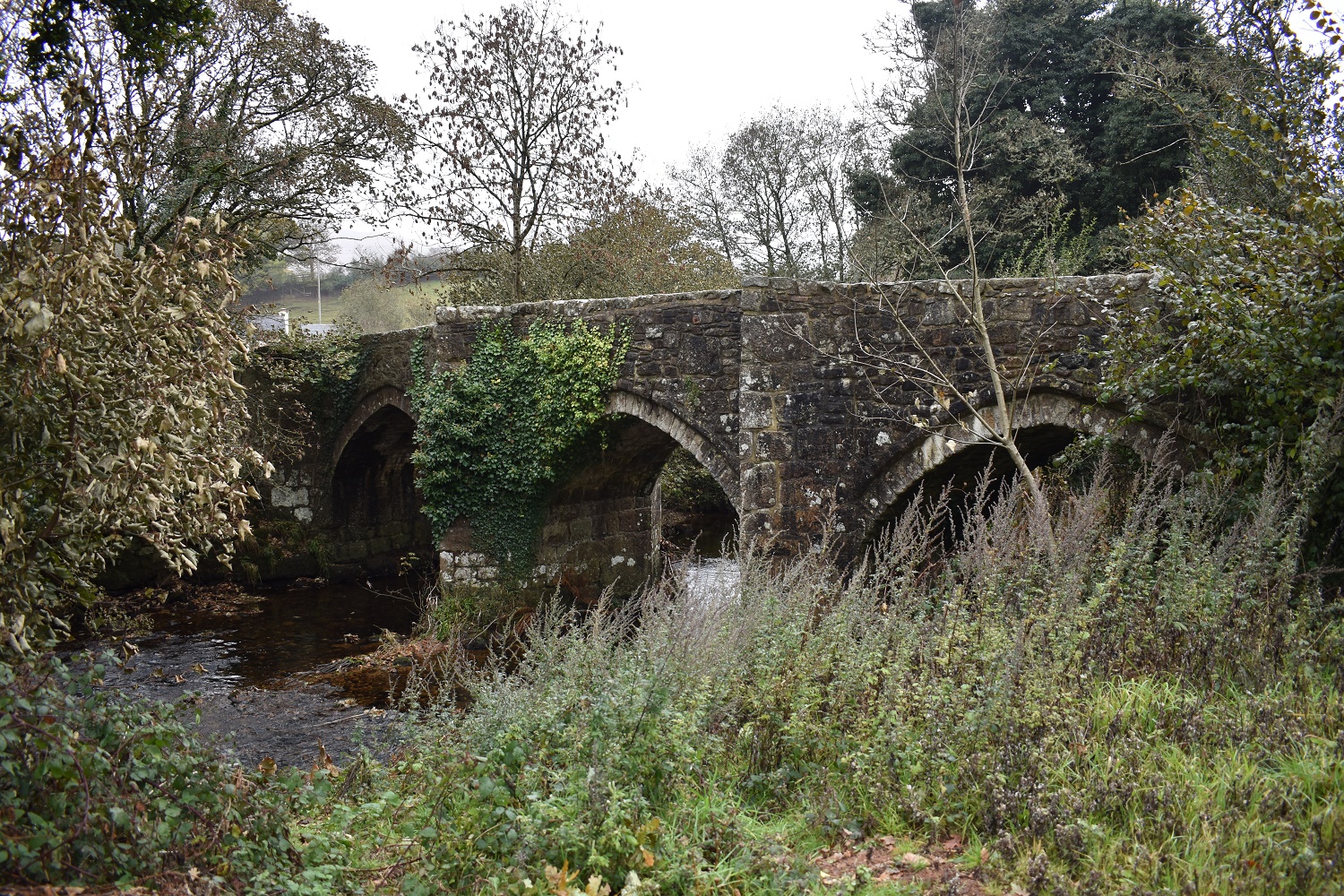 This is a road bridge that spans the Teign River just outside of Chagford. The bridge has 3 arches and has been in place, it is believed, since the 1590s. There are maps somewhere that say a bridge was here from around 1200, but this structure is believed to have been built in the 1590s. The road over this bridge leads from Chagford to Murchington and is pretty narrow and only really passable with a car.