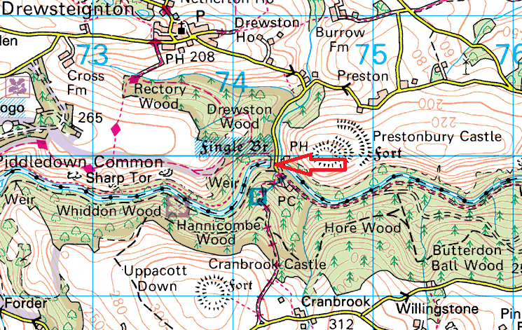 Fingle Bridge is a 17th-century stone arch bridge carrying an unclassified road over the River Teign near Drewsteignton, This packhorse bridge has three arches and the two central piers are surrounded by triangular cutwaters extending upwards to form pedestrian refuges, and it is a Grade II listed structure. There is a fine pub, the Fingle Bridge Inn right by this bridge and a classic walk from Castle Drogo via the Hunters path brings you here, before returning via a path on the south of the river. The bridge takes its name from the Fingle Brook which flows into the River Teign at this point. The bridge sits on a key crossing point of the Teign between Prestonbury and Cranbrook Castles.