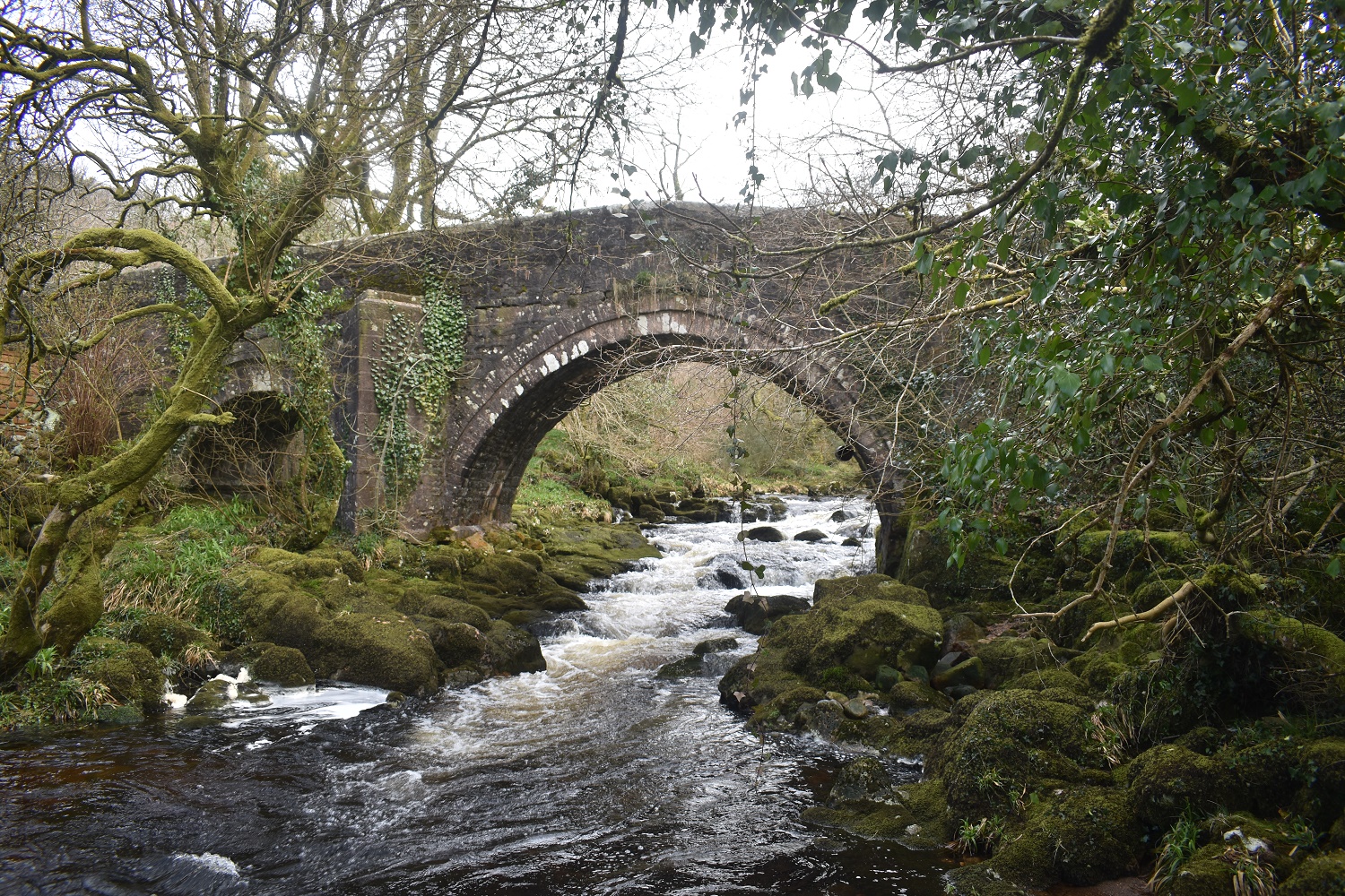This bridge sits just to the north and west of the small village of Harford on the southern side of Dartmoor. Keep heading along the road past the church and plunge downhill to the bridge over the River Erme. Its a small and narrow bridge with a single arch through which flows the river.