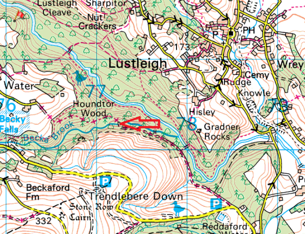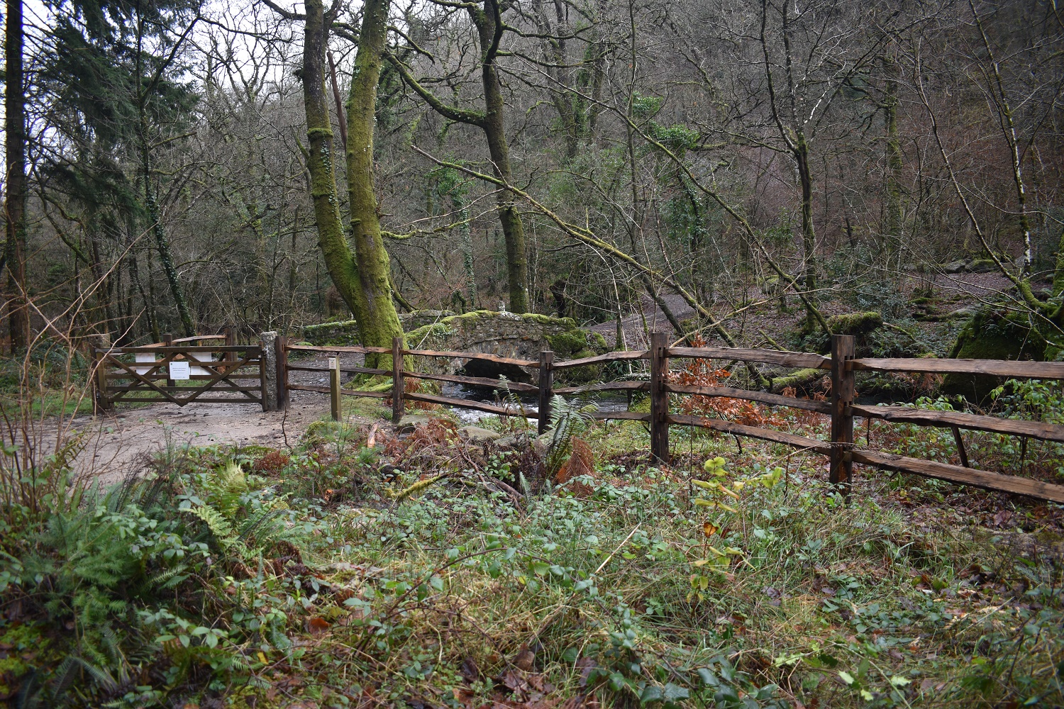 This is a fine bridge sitting within Houndtor Wood to the southwest of Lustleigh and its cleave. It crosses over the Becka Brook after it has left Becky Falls on its way down to the River Bovey. Its a simple packhorse stone bridge which carries the old Manaton road over on its way to the hamlet of Water and can be easily reached from Water or the parking near Reddaford Water.