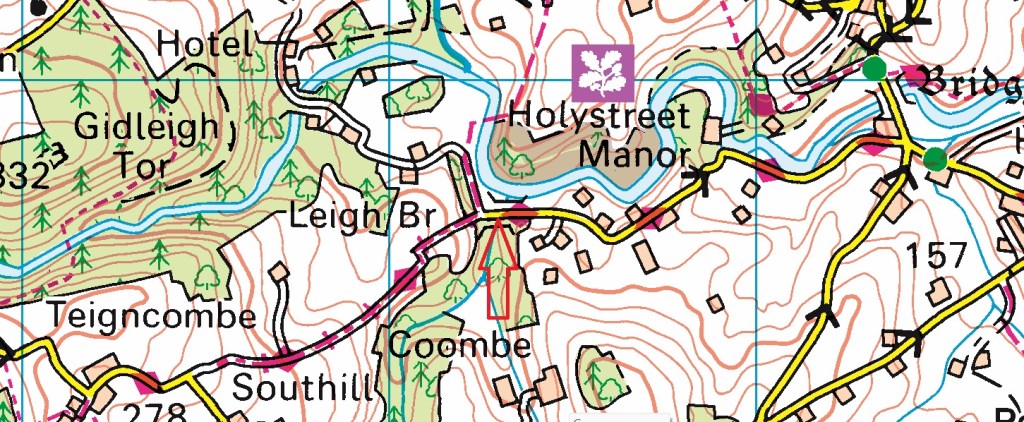 To the west of Chagford, near to Gidleigh Park is Leigh Bridge, the two Teign Rivers join under this bridge, with the South version passing under the bridge to join its northern brother. Nearby, towards Gidleigh Park are some stepping stones across the river to add to a crossing point of this river. Also at this point is Leigh Bridge Rocks and a cross on top of the outcrop. The walk over this bridge is included in the Two Moors Way route as well.