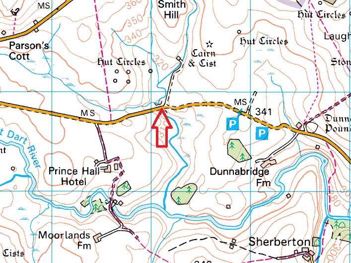 This large stone bridge sits on the road between Dartmeet and Two Bridges and obviously spans the Lower Cherry Brook not too far from the Prince Hall Hotel. The Brook continues on its way to the West Dart river to the south, with areas of open moorland and farm around the bridge, alongside a parking area.
