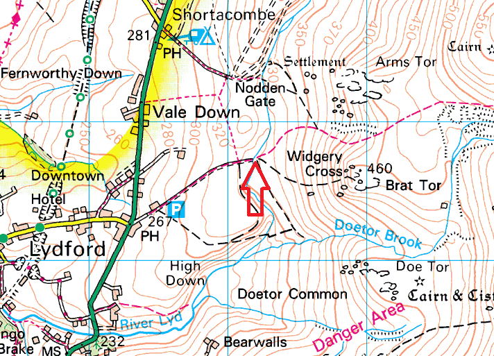 This is a small wooden bridge, a set of stepping stones and a ford across the River Lyd as it begins to widen on its way to Lydford. It is also known as High Down bridge and ford. There’s a car park nearby and a pub (The Dartmoor Inn, Lydford). Its an attractive spot with Arms Tor and Brat Tor providing a backdrop, if the water is low then the stepping stones can easily be used, it is also a very popular spot with the car park busy in the summer months.
