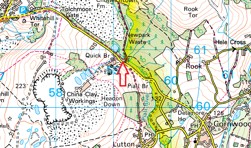 This is a road bridge sitting right on the boundary of the Dartmoor National Park, on the southern edge, between Cornwood and Lee Moor. There is nothing special about this bridge really, it sits right by the entrance to the Headon Clay Works and spans the outflow from one of the streams from the Headon Works. This granite bridge carries plenty of trucks coming out of the works, as well as the traffic between Cornwood and Lee Moor. There’s a decent parking spot on its south eastern side allowing for a good walk up the Newpark Waste path to Penn Beacon and beyond.