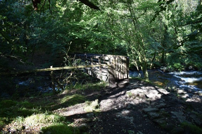 This bridge spans the River Taw in Skaigh Woods/Belstone Cleave and is named so after Henry Williamson’s creation Tarka the Otter which is carved into the bridge. This bridge also sits on the Tarka Trail which runs from Eggesford down to Belstone Cleave and on to Okehampton and beyond. There are a number of passages from the book written along the bridge for those that know their literature. The bridge itself is easier to find from the path on the southern bank of the river as the path leads right to the bridge. On the northern bank paths you will need to drop down from the higher path down a slanted path which heads back and down to the lower path. However the lower path is around 40 metres from the bridge and no obvious link path goes to it. So be aware on your map reading or GPS, you are looking for an S bend in the river and on the OS maps the paths don’t seem to link but the bridge crosses the river at this point. Its a nice little wooden bridge and if you are looking for a nice little walk out of Belstone then walking from Belstone Cleave Bridge to this one and back along the other bank is a nice way to spend an hour.