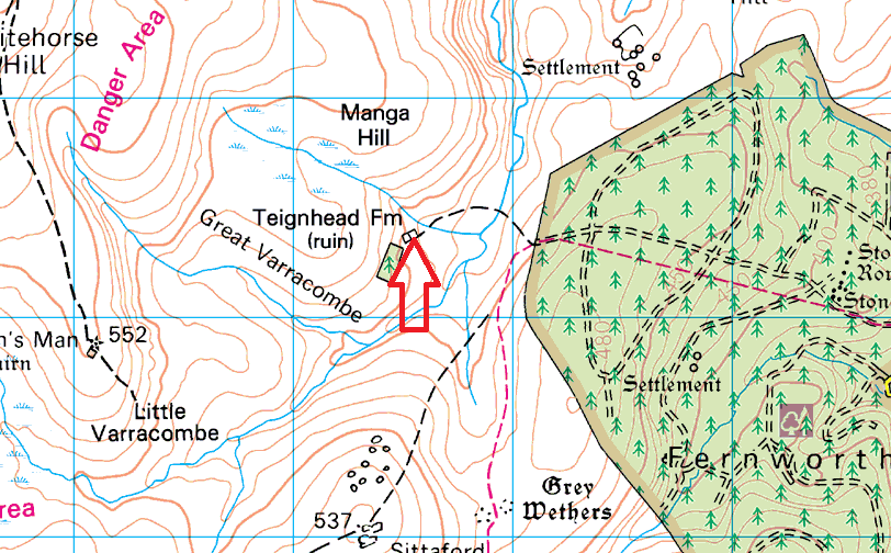 Teignhead Farm originated from the late 1700s when it was built, and I have been informed (thank you to Star who has family who farm nearby) that it was certainly still in use up to 1943, when it was requisitioned by the MOD. The farm was never returned after the war and it is now a ruin which sits not far from the edge of Fernworthy Forest just across the pretty Teignhead clapper bridge, Sittaford Tor and Grey Wethers are close by also. There is still part of the house standing and the fireplace can clearly be seen. The field walls surrounding the farm are still in place along with a number of gateposts.and the whole farm sits in a number of trees. Its a lovely spot which sees a number of wildcampers visit regularly.