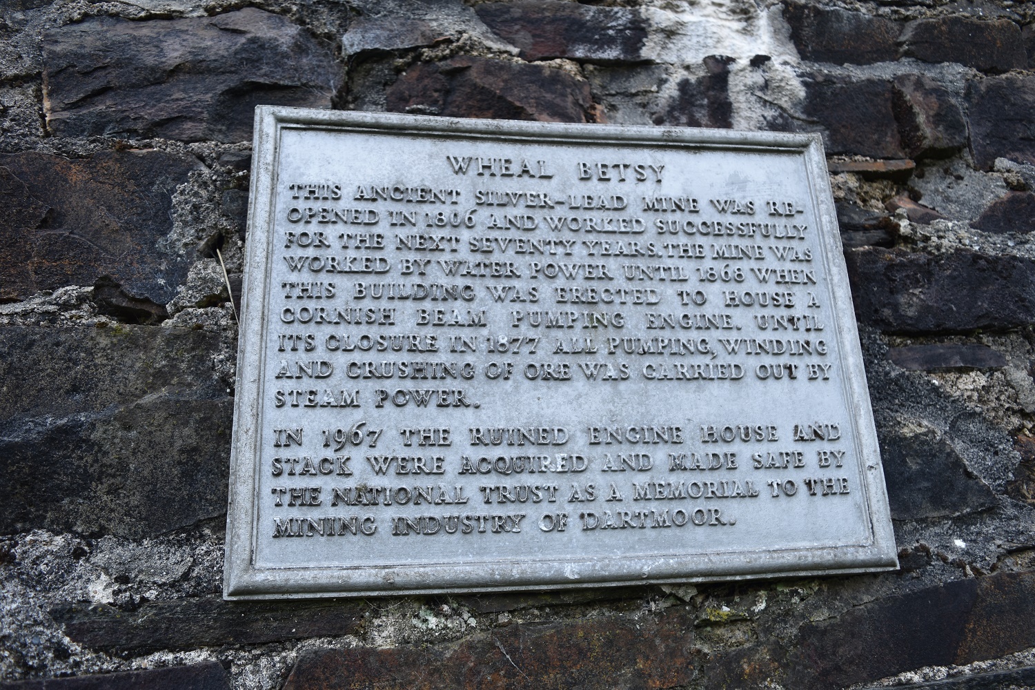 Wheal Betsy is the only standing remains of an engine house from a mine on Dartmoor. It stands beside the A386 as you head north out of Mary Tavy towards Lydford and is now a National Trust property. The lead and silver mine started around 1740 and was at times fairly profitable (when the price of lead was good), yielding large amounts of lead and silver. The mine shut around 1877 after employing around 120 local people for over 120 years, the remains were luckily saved by campaigners after the army was given permission to destroy it. It stands today as a testament to the mining on Dartmoor.