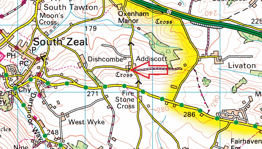 A nice little cross which is still in good condition sitting beside the crossroad from Ring Hill towards Addiscott Farm/house. The cross was used as a marker for those travelling to the church at South Tawton and sits in the hedgerow at the crossroads, sometimes hidden by the undergrowth.
