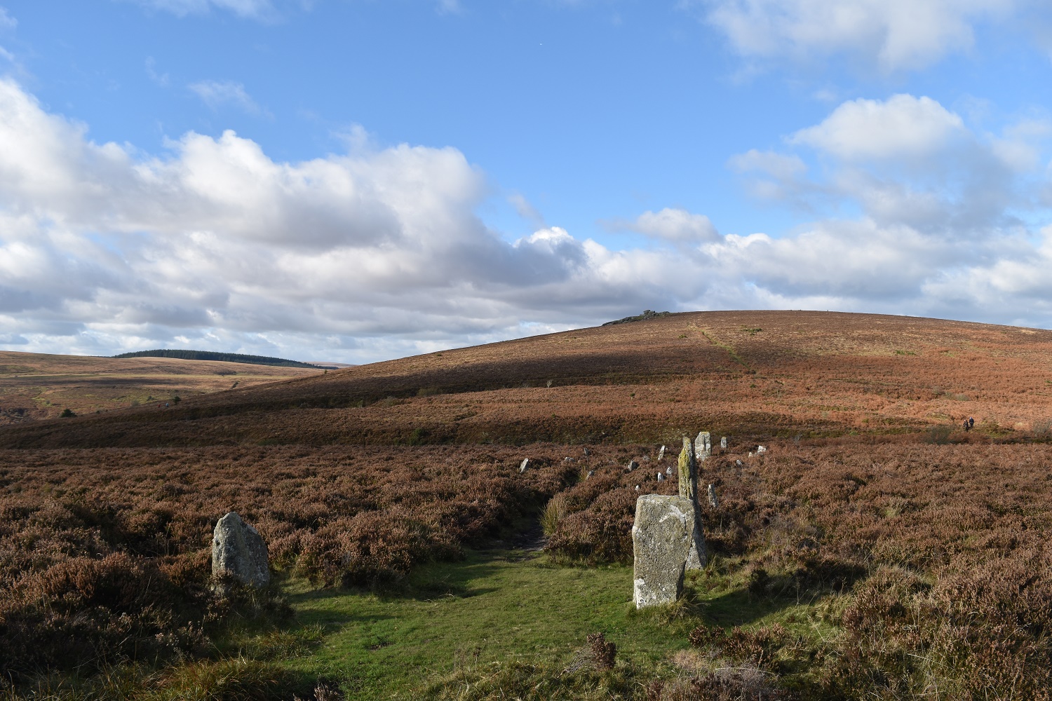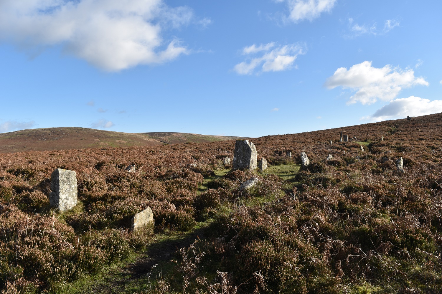 This stone row is a rare and a fine example of a triple stone row sat on the side of Challacombe Down in central Dartmoor. A number of the stones at the lower end of the row have been re-erected, probably due to the nearby tin mine workings, which ran between Birch Tor and Challacombe Down. The tallest stone is furthest up the hill and from that point you get a good view back along the row and on to Birch Tor. There are currently 82 stones, although more would have stood before the mine dug up those at the northern end, it is also very easy to imagine this stone row sitting around at the same times as Grimspound, just a few hundred metres to the east.