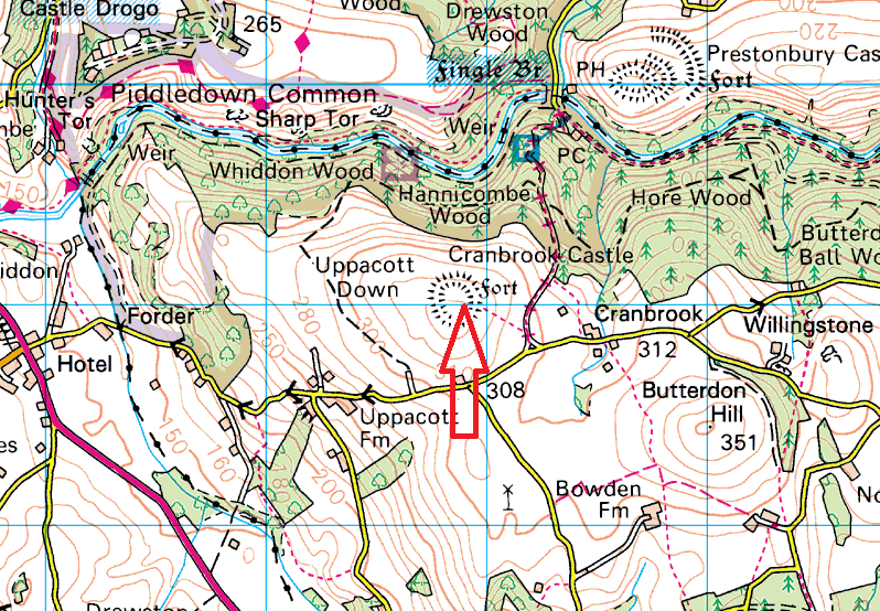Cranbrook Castle is one of three castles, or more accurately iron age hillforts in the area around the Teign valley to the east of Chagford. The hillforts are Cranbrook Castle, Prestonbury Castle and Wooston Castle. Each is clearly marked on the Ordnance Survey Explorer OL28 Dartmoor map. They give fantastic views of the surrounding area and would have provided a commanding position to the occupants.This hillfort is defended by a single rampart and ditch encircling it which encloses an area of 13 acres. The hillfort would have been built around 0 to 500BC.