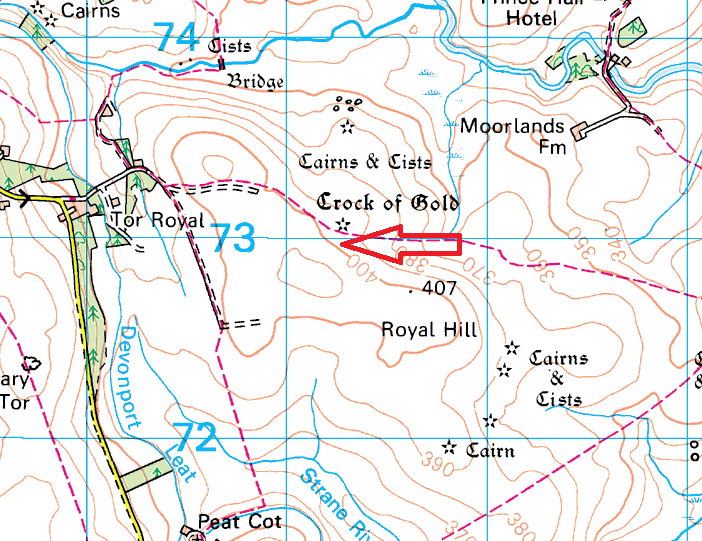 Here is another of those brilliant Dartmoor legends. The truth about the Crock of Gold is that it is likely to have been a cist which held the cremated remains of a local of the area. However the legend is that it held gold guineas of a dead chieftain and the local folk had heard of this tale and told the story in the local inn. A resident of Royal Hill, Luke Mudge was a net maker for the local rabbit warrens, he made little money in his trade but knew of the Crock of Gold, the folklore was that if you robbed a cist then the evil curse would strike you. Luke however had an accident with boiling water making his hand unusable for making nets. His thirst for the gold grew and one night he took an iron bar to the cap stone and removed it. He put his hand in and found nothing but broken pottery!! Then the clouds gathered and plunged the Royal Hill site into darkness, all of a sudden the capstone began to move, crushing Luke’s hand and trapping him for days. He ended up in hospital and then the workhouse in Tavistock, the locals in the inn re-telling his tale for years to come! As it is the Crock of Gold is a fine cist with great views on a clear day. It is not as it says on the OS map to the north of the path, but to the south about 10 metres from the track.