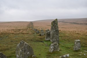 Down Tor Stone Row sits half a mile north of Down Tor itself on an area of flatish ground that rises slightly at either end of the stone row. Some will call this Hingston Stone Row, after the nearby hill, but for me and many, many others, its always Down Tor Stone Row. There are over 150 stones in this row, with a small stone circle one end and a ruined cairn at the other end, the tallest of the standing stones is 3 metres high. The site was repaired in 1896 in order to re-erect a number of fallen stones back into their original holes. For me this is easily the best of the stone rows and certainly the most complete and easily photographed one on the moor.