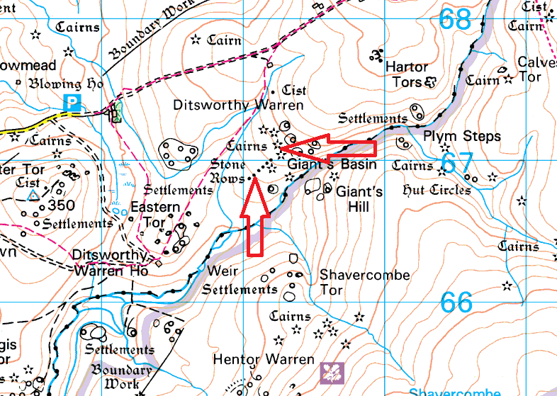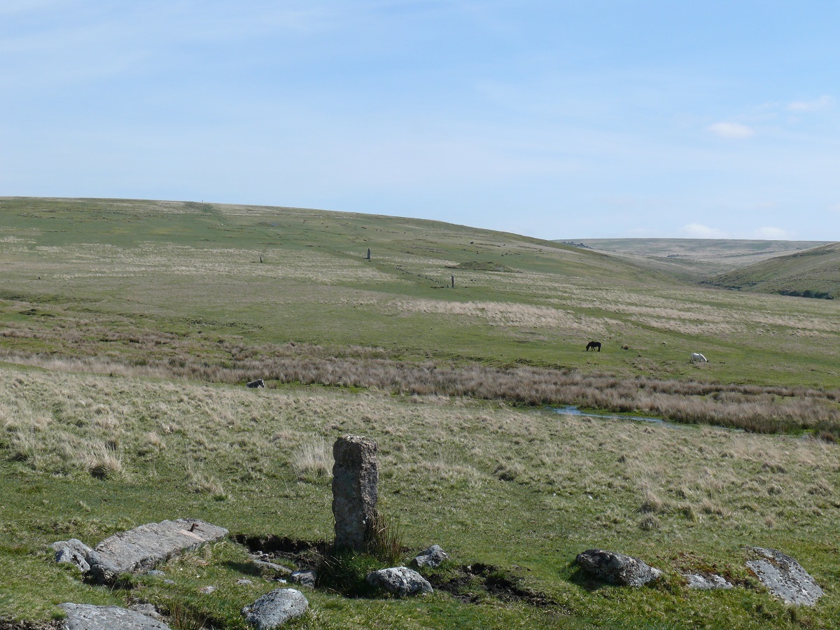 Looking across to Drizzlecombe, the two standing menhirs linked by a stone row with the Giant’s Basin just behind