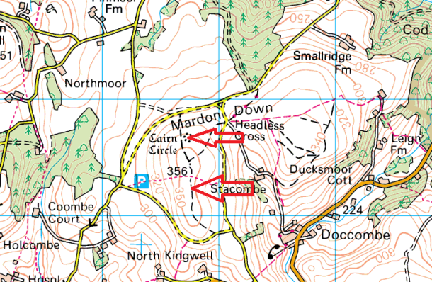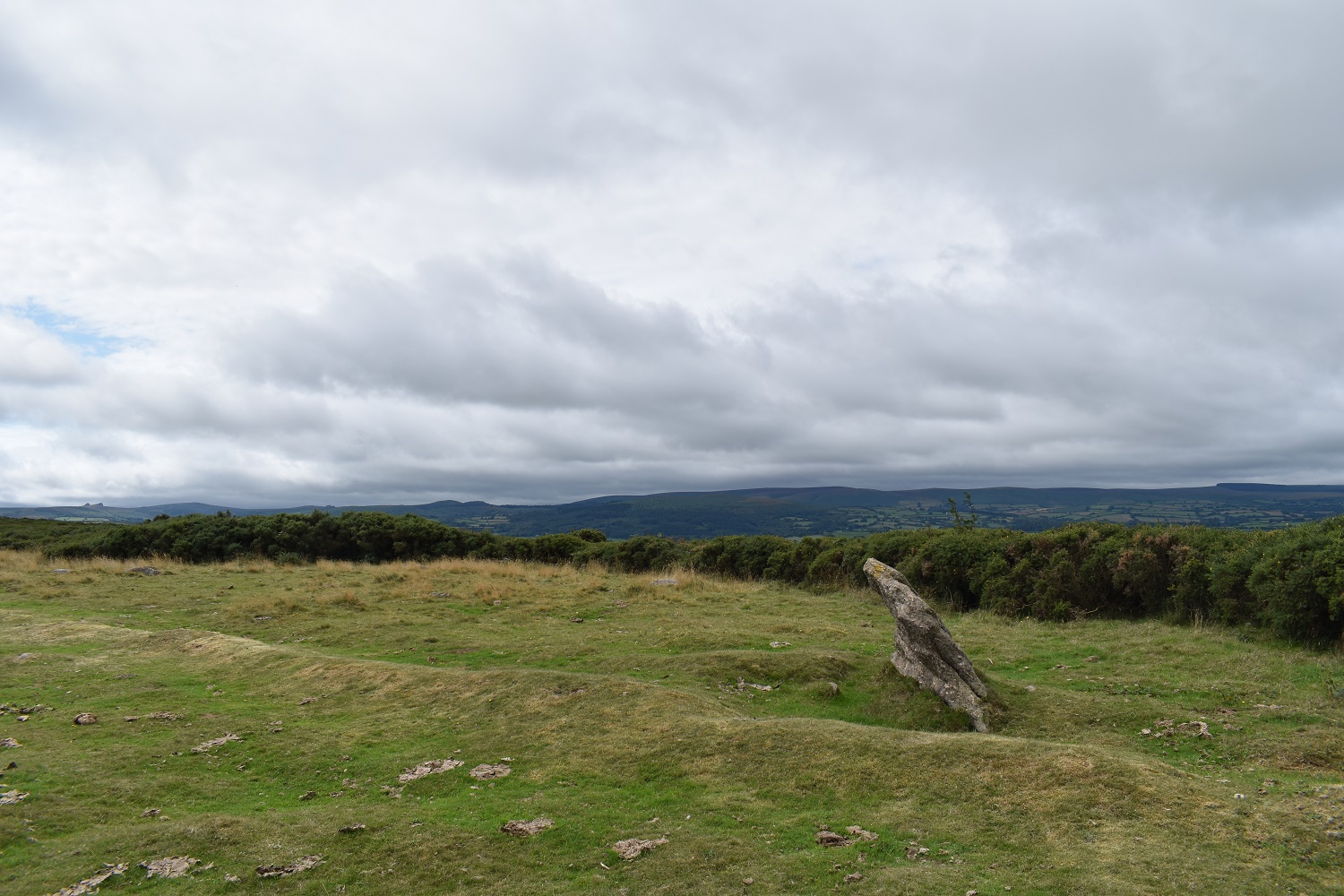 Mardon Down Stone Circle is the largest stone circle on Dartmoor at around 35 metres in diameter. It is situated in a fine spot, at the top of Mardon Down, with far reaching views across to Cosdon Hill and running down the eastern side of Dartmoor to Haytor. The stone circle sits on the main path running across the top of the down and this path links it to a smaller stone or cairn circle to the north of the main circle. The stones on the main cairn circle are difficult to see, mainly due to the size of the site, this place doesn’t look anything like Scorhill or Grey Wethers. Most of the stones are flat or fallen, although those on the western side stick up a bit more and the most obvious stone leans at an angle. The stones in the cairn circle to the north are more complete and stood upright and form a good circle, reminiscent of Nine Maidens near Belstone.