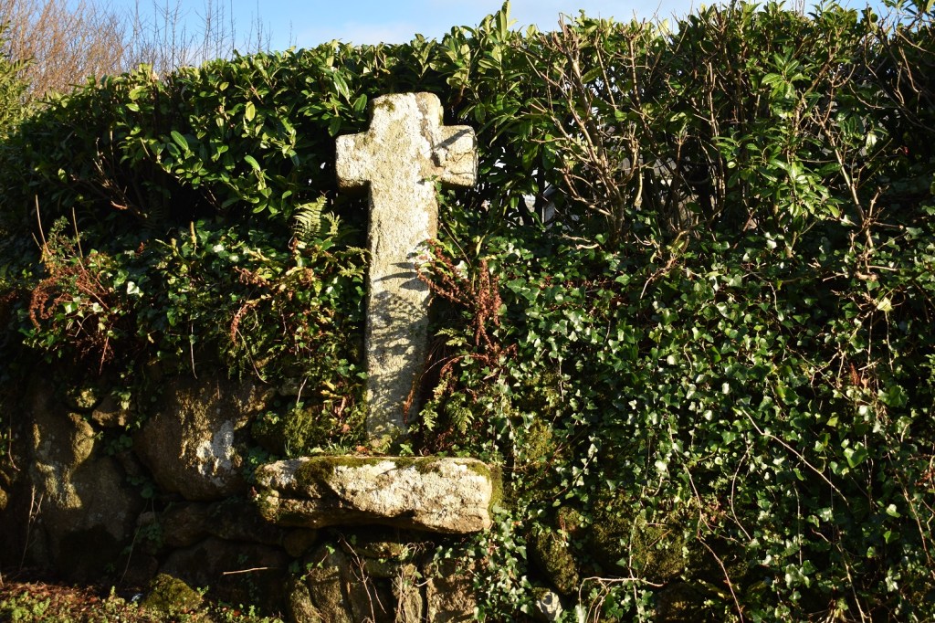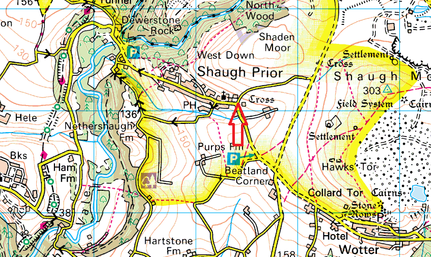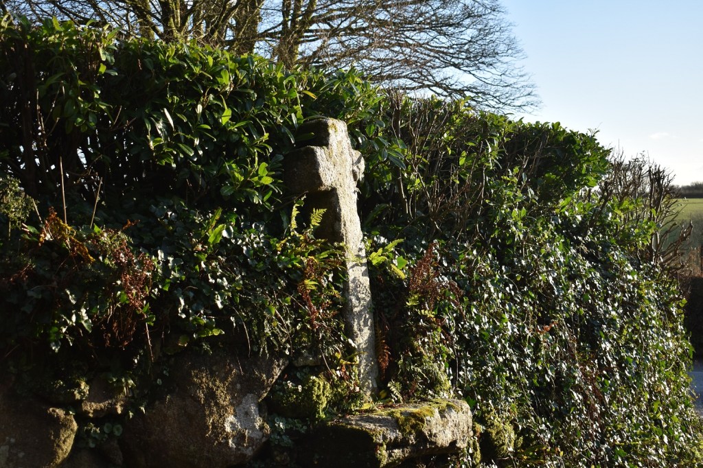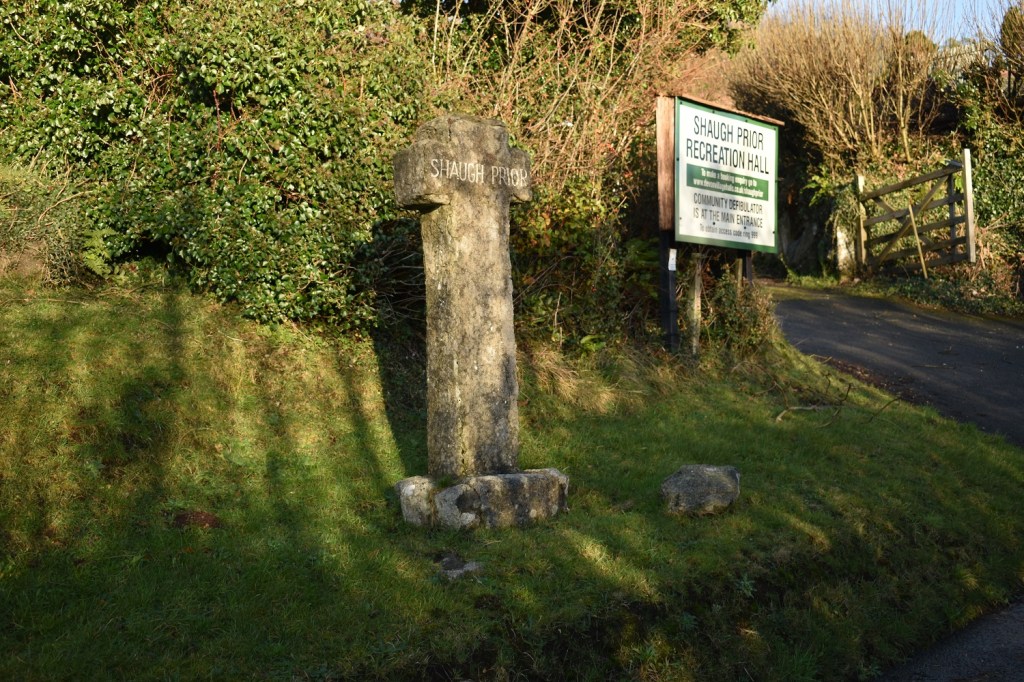 This is a cross set into the hedge and wall at the eastern end of the village of Shaugh Prior, just past the church itself. The cross sits on a large stone plinth which protrudes from the wall, the cross shows a small amount of damage at the top right hand corner (repaired in 1870 ish) but otherwise it is in a good state. It is believed that this is cross was used as a preaching cross, rather than the more common waymarkers between abbeys around Dartmoor. In the village centre by the hall is a fake cross, made of concrete with the name of the village painted on the cross, not for me.