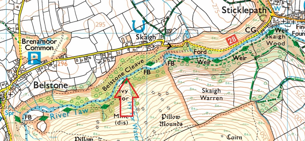 As the name suggests this cleave runs from the village of Belstone to the east towards another village called Sticklepath. It runs for about a mile and is now heavily wooded on both sides, with tors on each side, including Ivy Tor and The Cliff, with Middle Down Tor at the Sticklepath end. The River Taw runs through the cleave, carving its way out from Taw Marsh on its route towards Barnstaple. In years past there was a mine on the southern side of the cleave, alongside a firing range with the target sitting west of Ivy Tor also on the south side, and the firing mounds on the northern side at 100 and 400 yard ranges. A metal box (the target) still lies not too far from Ivy Tor.