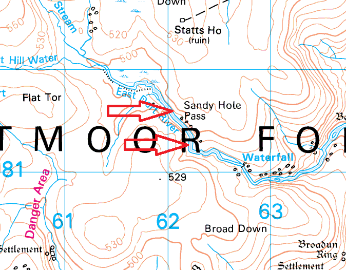 Sandy Hole Pass sits beside the East Dart River in an area of Dartmoor that was heavily mined for tin. The look of the area is man-made and its reason was in order to narrow the East Dart River to create a faster flow of water. Creating the granite walls did this, and allowed the miners to use the river to carry away the sand and wastes from their tin mining. It is believed that Dartmouth harbour silted up because of the mining at Sandy Hole.
