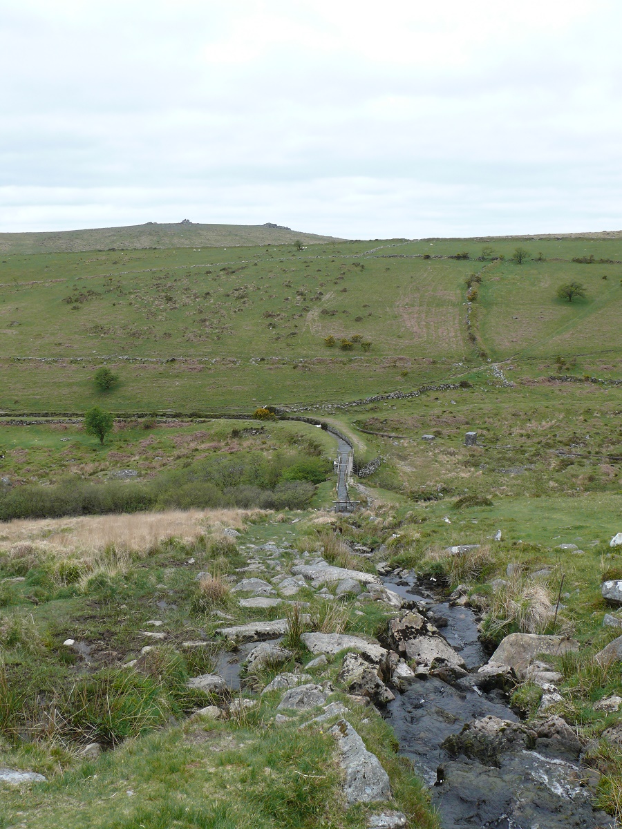 Devonport Leat near Older Bridge, in the distance Sheepstor on the left and Leather Tor to the right